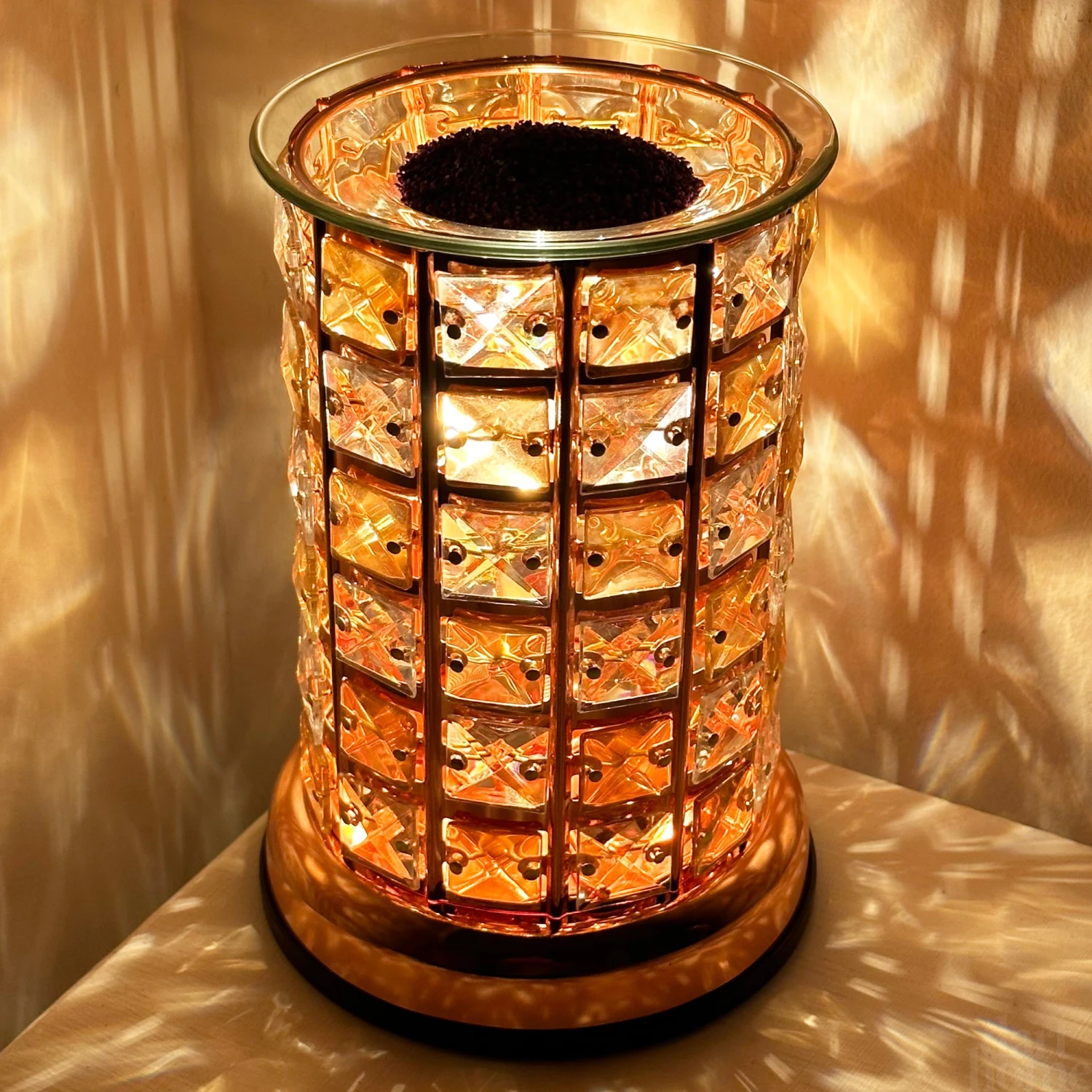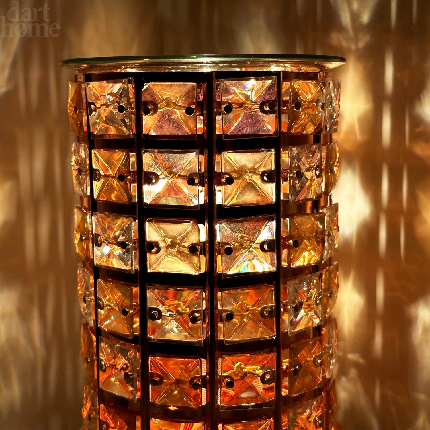 A gorgeous electric wax touch melt burner aroma lamp featuring a 3d crystal jewel design, lighting the room with a soft amber orange colour around the lamp when plugged into the wall. Touch sensitive control function and glass plate to hold your favourite wax melts and oils to allow for your chosen scents to aromatise any room.