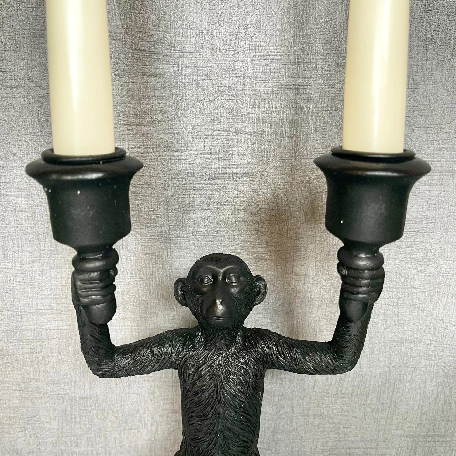 Features: Standing Black Monkey, Monkey Holding Two Church Candles, Leaf Shaped Base, Freestanding, Indoor