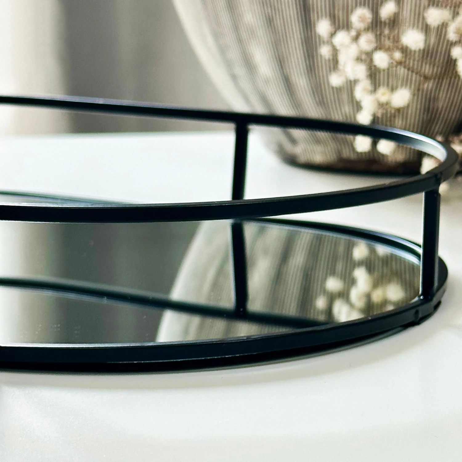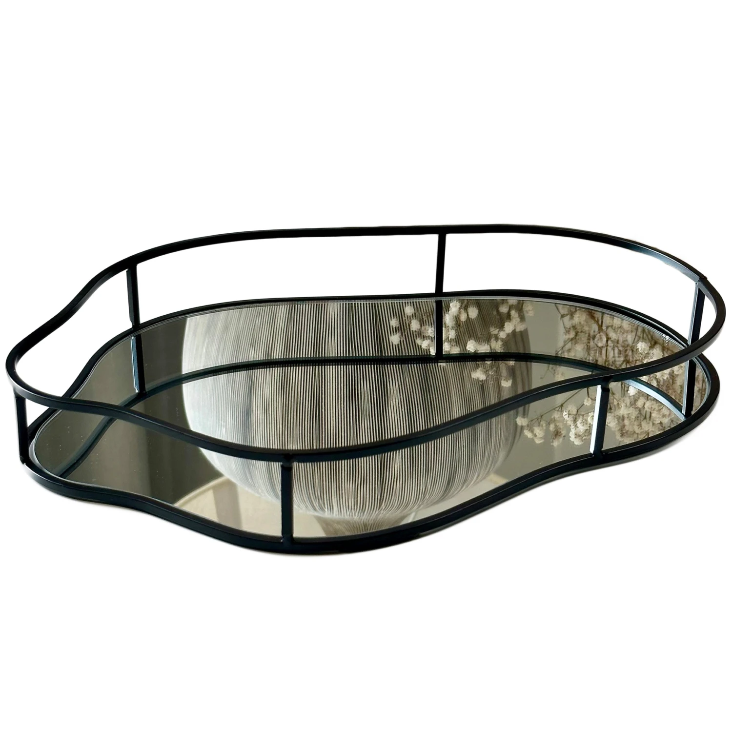 This stunning black pebble mirror tray exudes timeless elegance and sophistication. Its abstract modern design, metal frame, and decorative glass comes together to create a distinct and exclusive piece that will add a touch of luxury to any home. Style A.