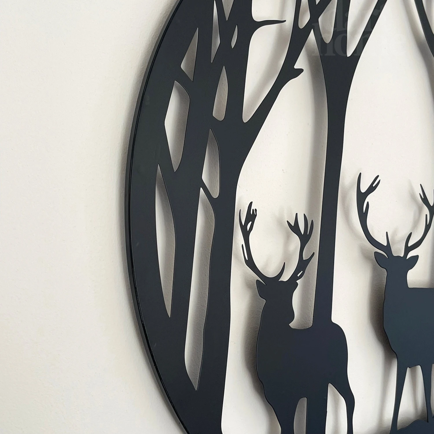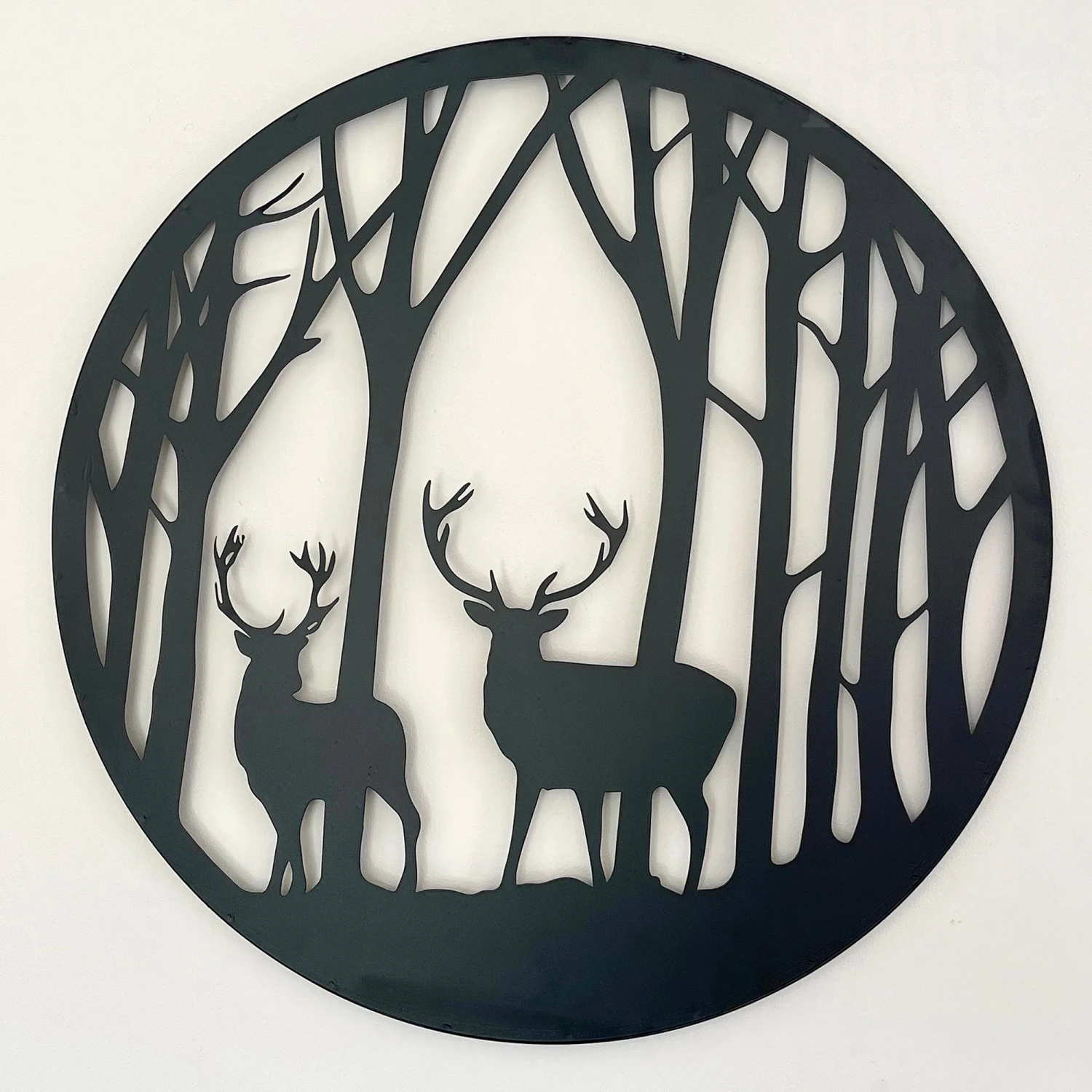 This silhouette black wall art captures a beautiful animal scene with forests and stags. It can be used indoors and outdoors and is a wall mounted piece.