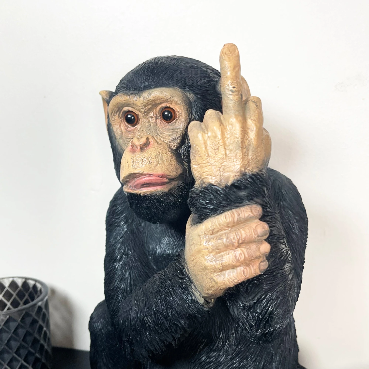 A hilariously rude and cheeky monkey gesturing the classic up yours with its middle finger. The novelty sculpture features a monkey in a realistic black textured finish. It is a resin ornament that will be a talking point in any indoor or outdoor space.