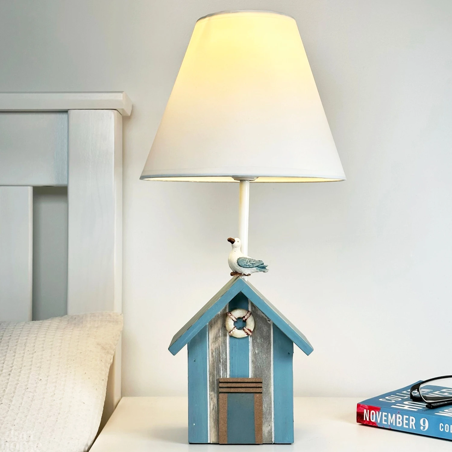 Bring the nautical seaside indoors with this blue beach hut lamp! The white fabric cone lampshade illuminates your space with an inviting ambiance, turning your bedroom into an inviting oasis. Transform your home to the ocean with this must-have piece!
