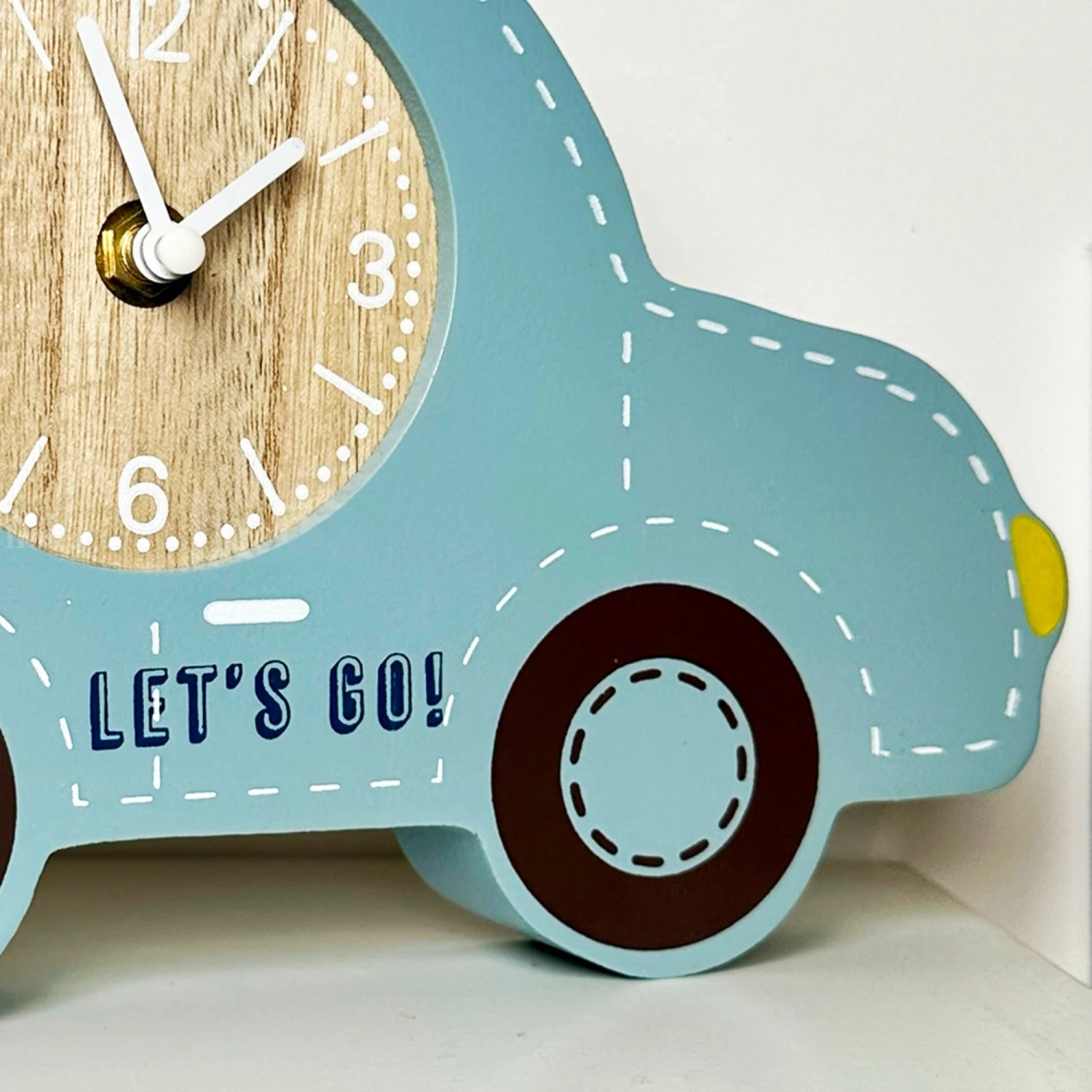 A must have accessory for your childrens bedroom or nursery. This car themed table clock features a baby blue car with a round interior clock with a 12 hour display. The battery powered childrens clock will kit your nursery out with a brightly coloured car theme perfect for any bedroom.