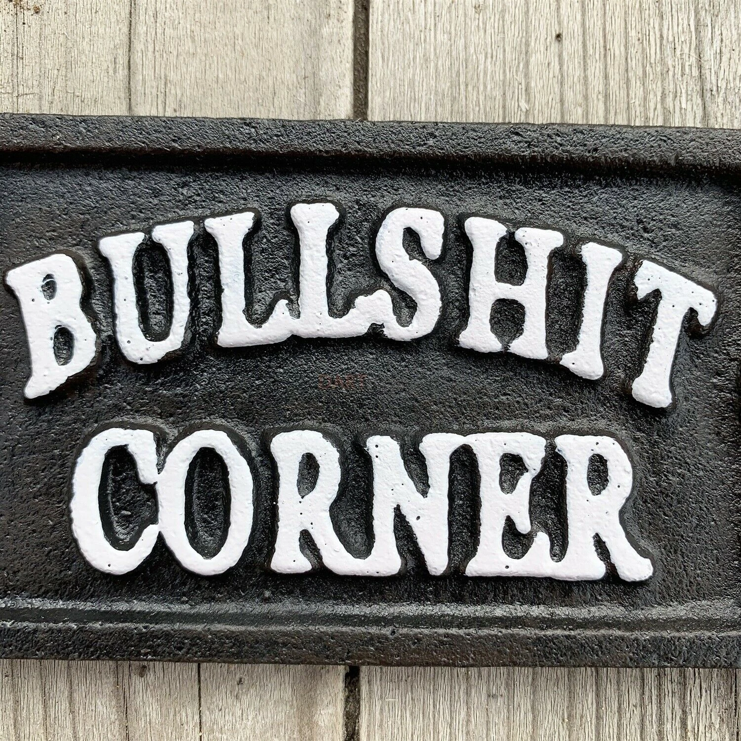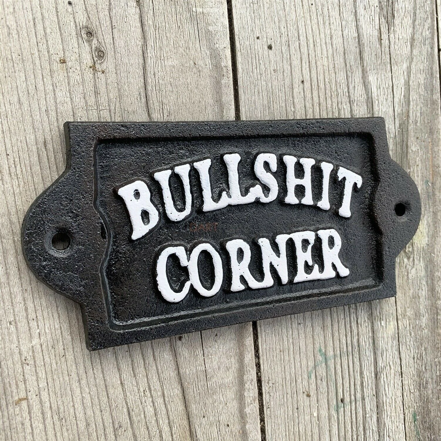This wall mounted sign has a distressed vintage black finish. It is made from high quality cast iron, designed for outdoor use. The text reads ‘Bullsh#t Corner’. It will look great in your garden on the wall, on the gate or by the front door.