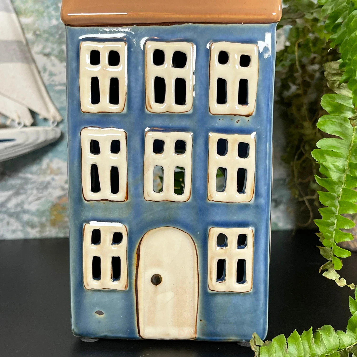 Stunning tall cottage house featuring blue walls and finished with a deep brown painted roof. This elegant colourful piece acts as a tea light holder that will glow when the lights are dimmed, offering a sense of calm and warmth wherever placed. It is made from glazed ceramics and is suitable for tea lights and indoor use only. It is a must have contemporary piece of home decor for your home.