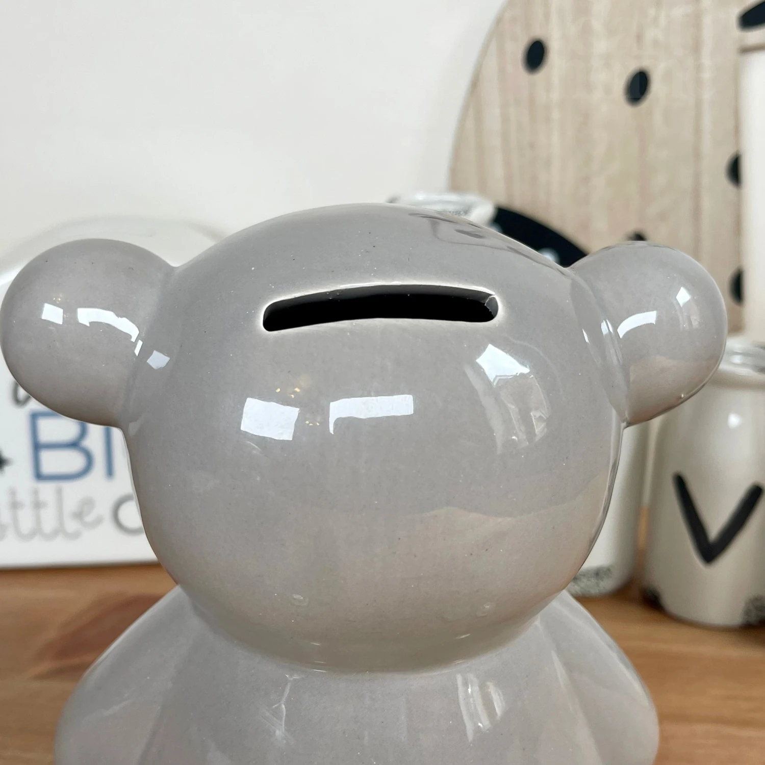 A coin moneybox perfect for keeping your little ones savings safe and sound until they need them! Made from ceramic, glazed and completed with a glossy grey finish, these cute teddy bear shaped money banks feature a bow tie and a rear coin slot. Equipped with a silicone cup on the bottom for when its time to dip into your hard work!