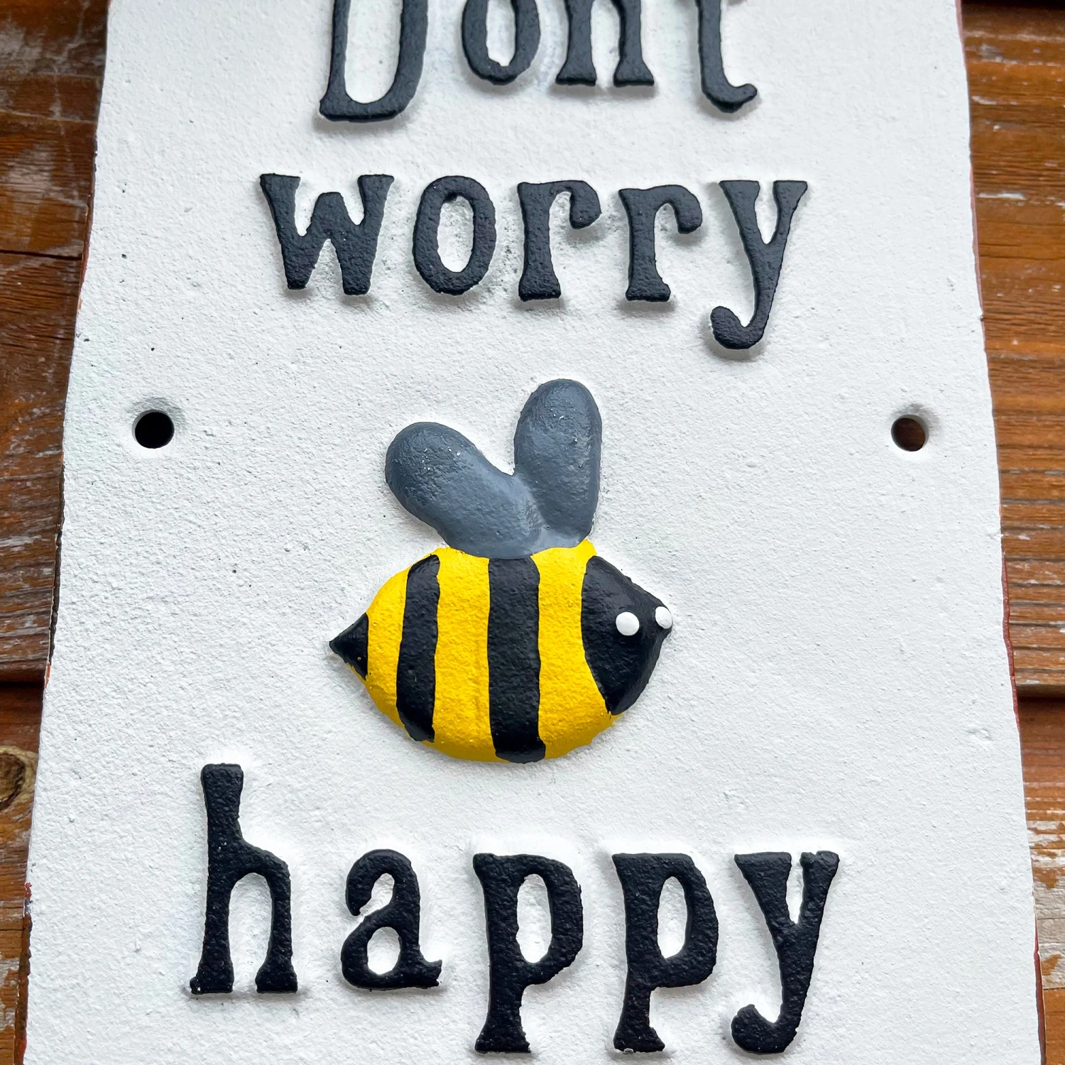 A beautifully contemporary bee themed cast iron sign, featuring traditional black fonted text reading “dont worry bee happy” with a large colourful bumble bee slotting in for the word bee. This novelty wall plaque can be used indoors and outdoors. It will look great on a garden gate, fence or wall.