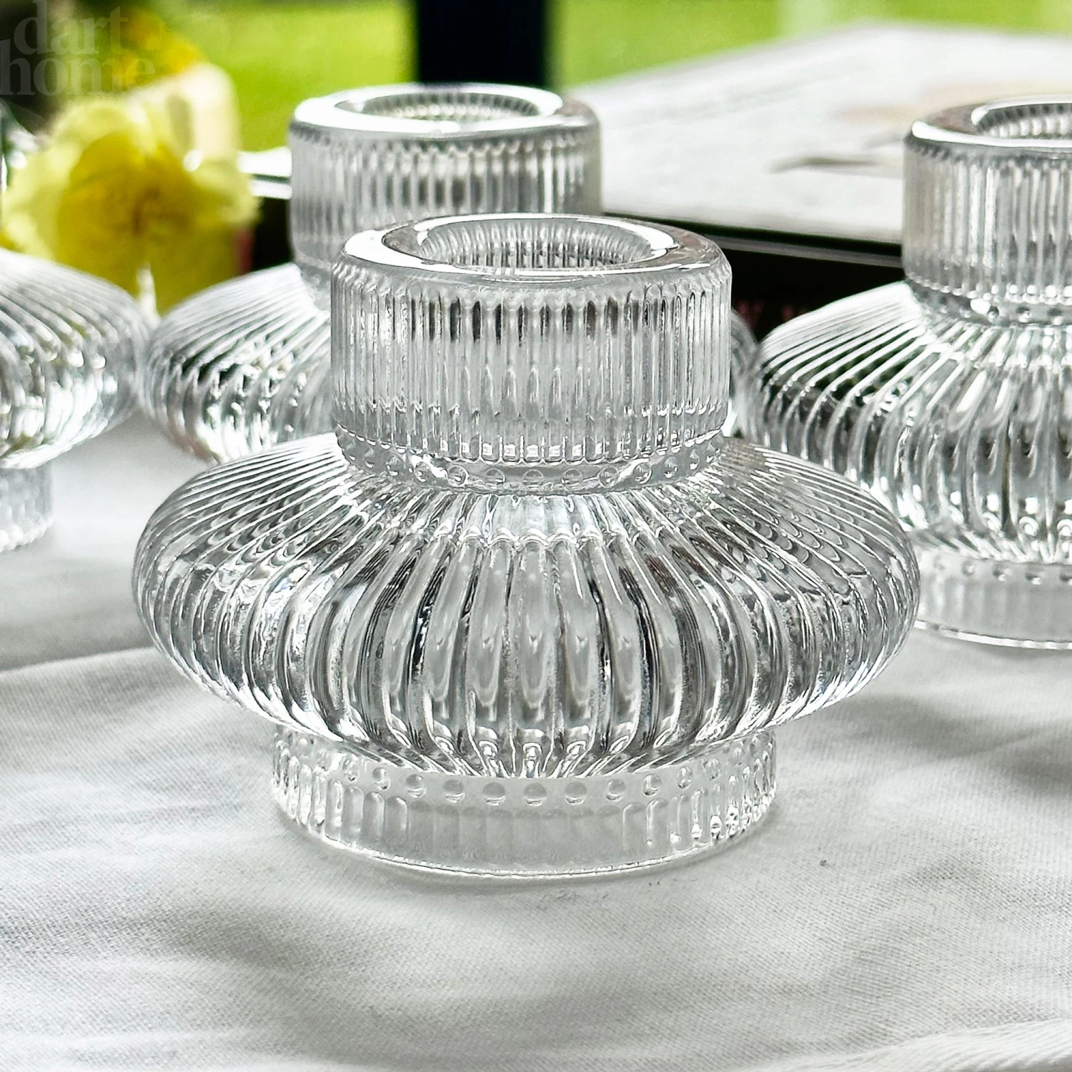 Add a luxurious touch to your dinner table with this set of 4 double sided candlestick holders. Crafted with the fine clear crystal glass, these candle decor pieces will bring a classic elegance to any atmosphere regardless of which way they are turned. Enjoy the mesmerizing radiance of dancing candlelight with this timeless set.