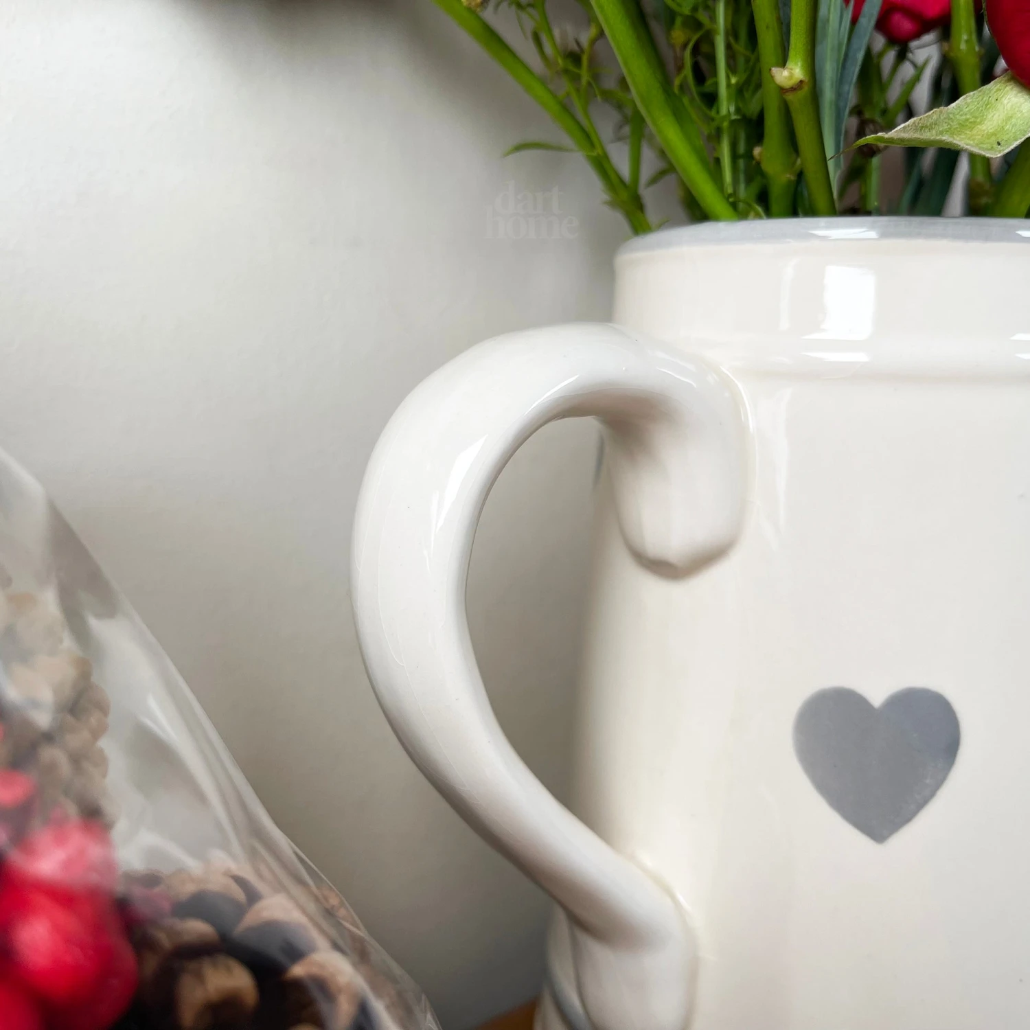This contemporary country style jug vase with faded grey love heart detail and grey trims, this jug vase is perfect for holding floral arrangements and will only enhance your wedding or kitchen table decoration.