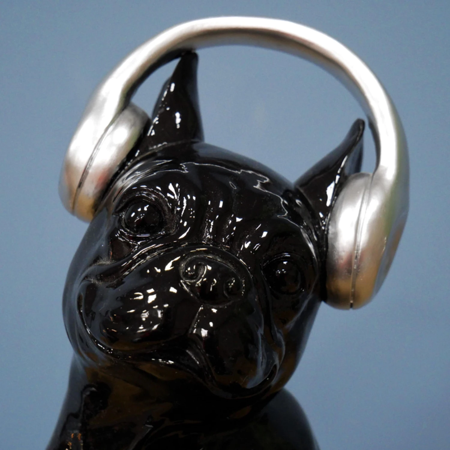 This bold sitting french bulldog, set with his silver headphones on tuning out, has a glossy black finish and is made with the highest quality resin.