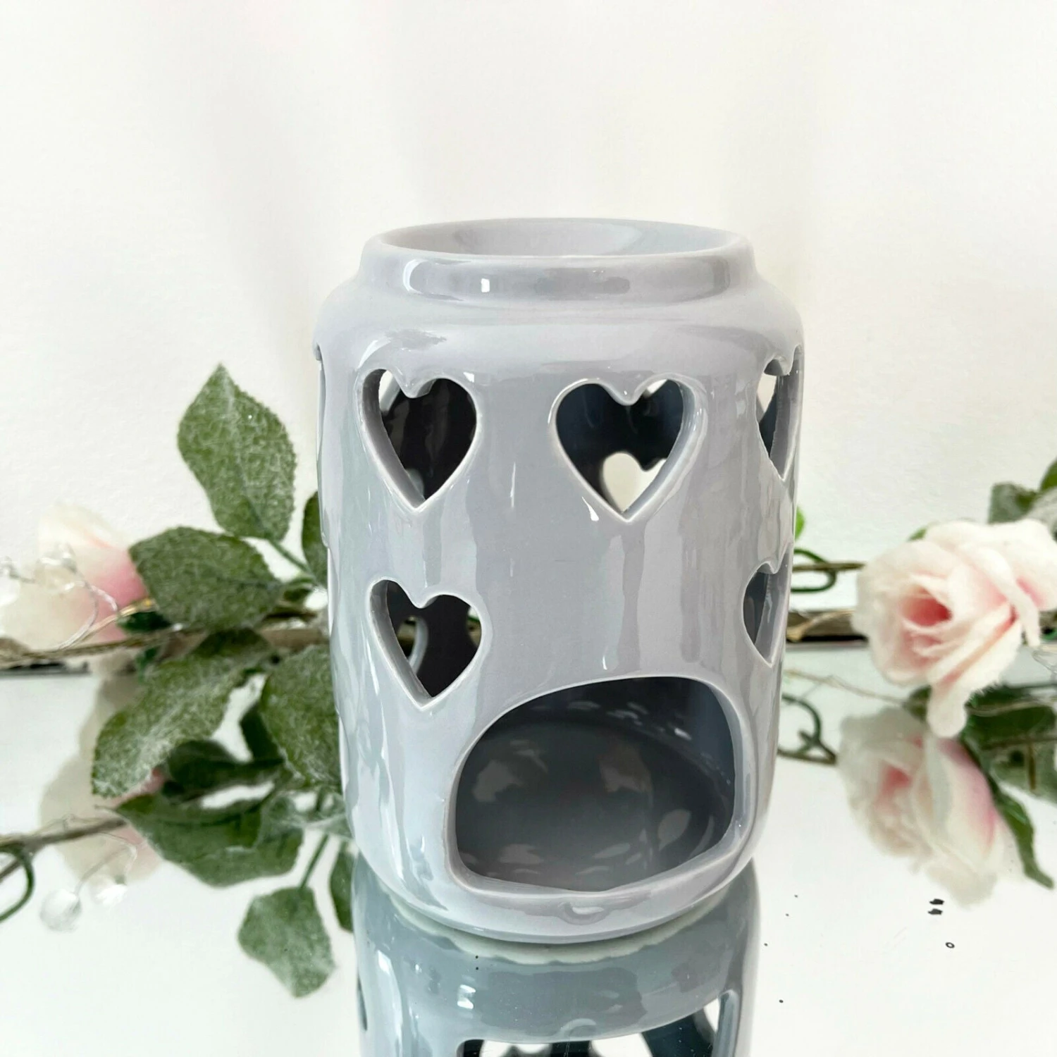 These burners have love heart cut outs in the design and come in three colours: white, grey and pink. They have a tea light candle holder space at the bottom and a round caved bowl suitable for burning wax melts and oil.