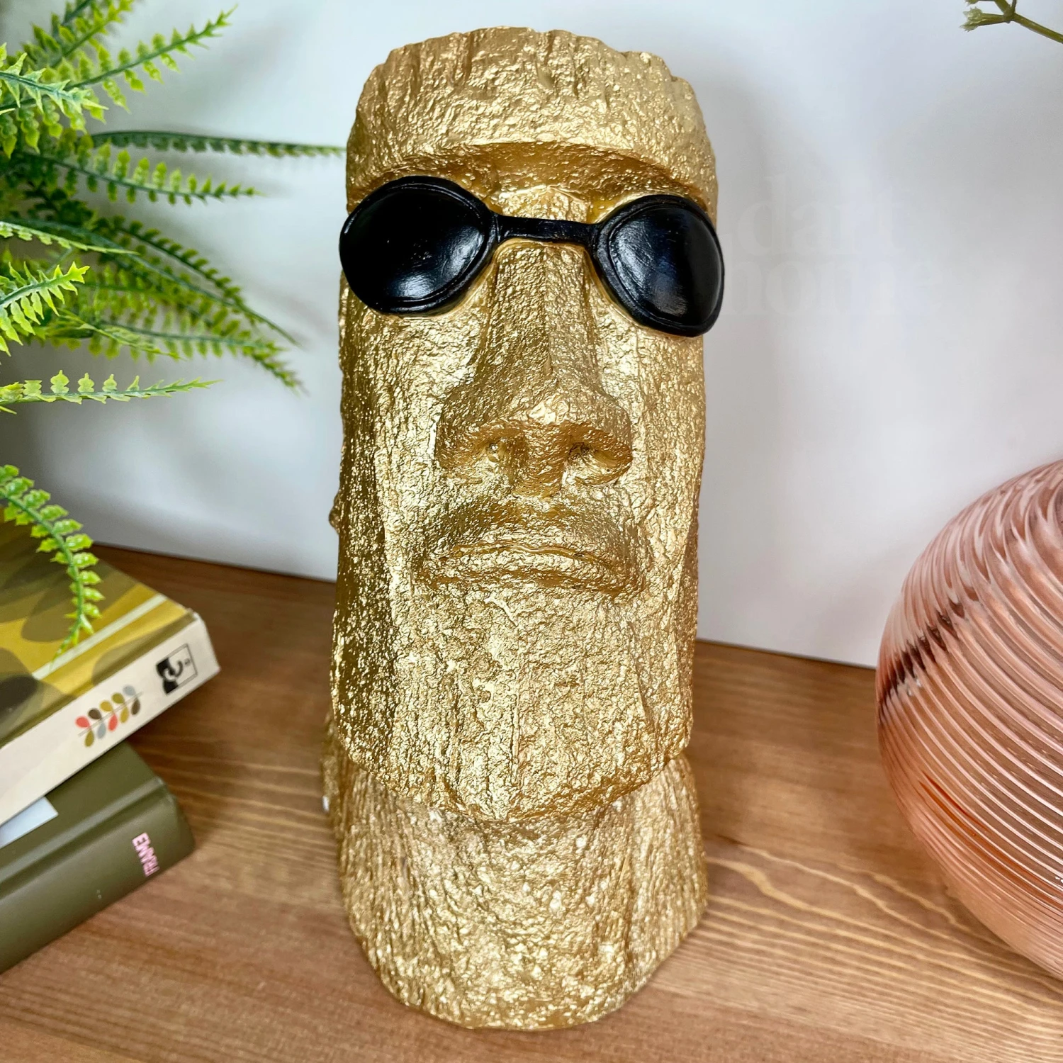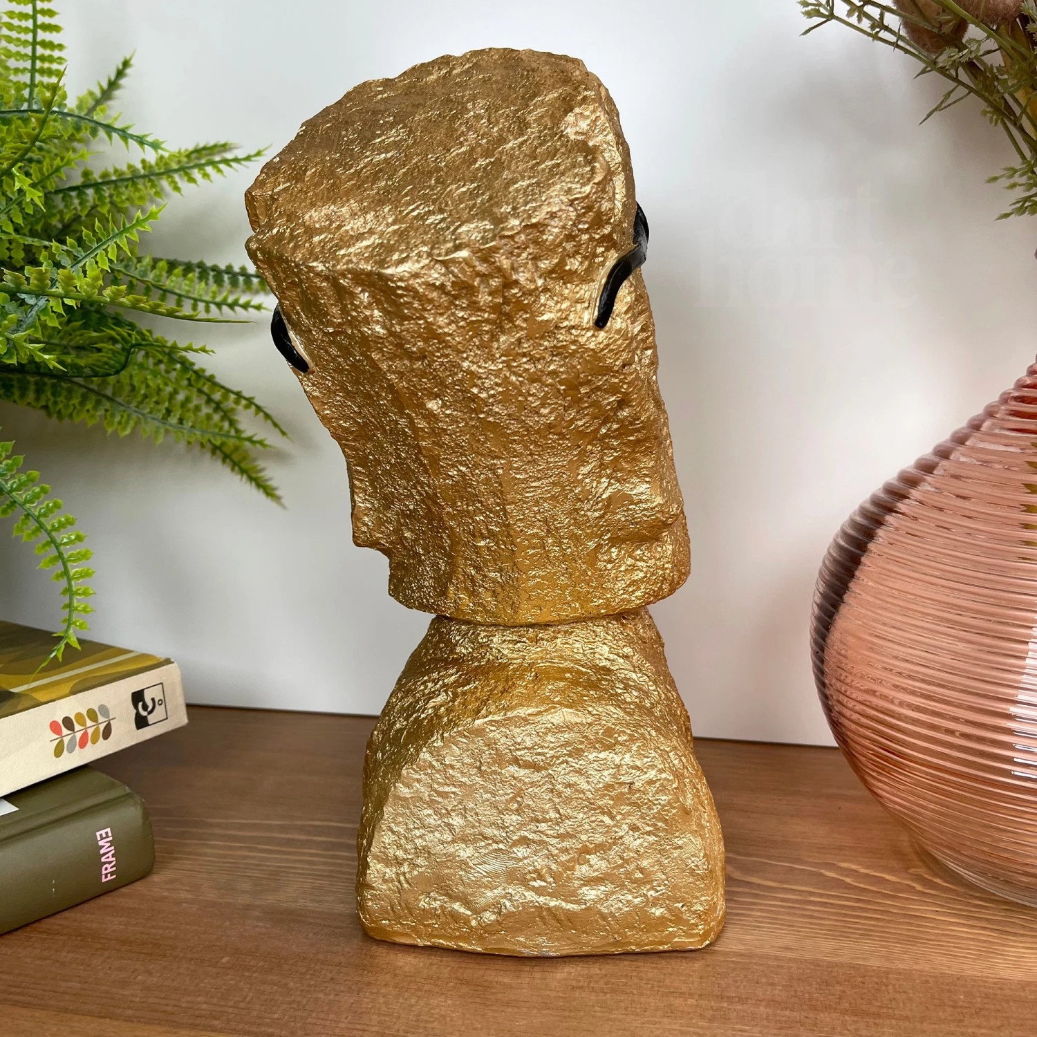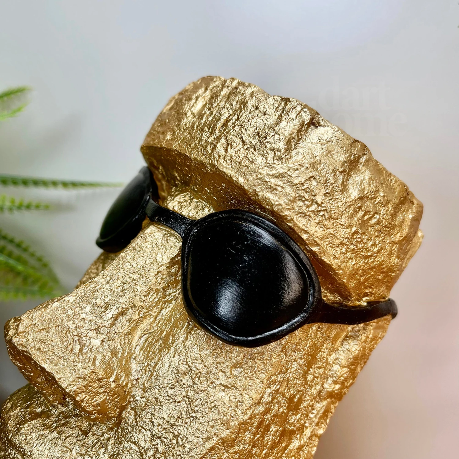 Bringing modern, cool and quirky style to a classic, historic Easter Island Head design. With a rough textured gold resin finish and striking black glasses to complete, this modern Moai Easter Island head will be a focal point of any room.