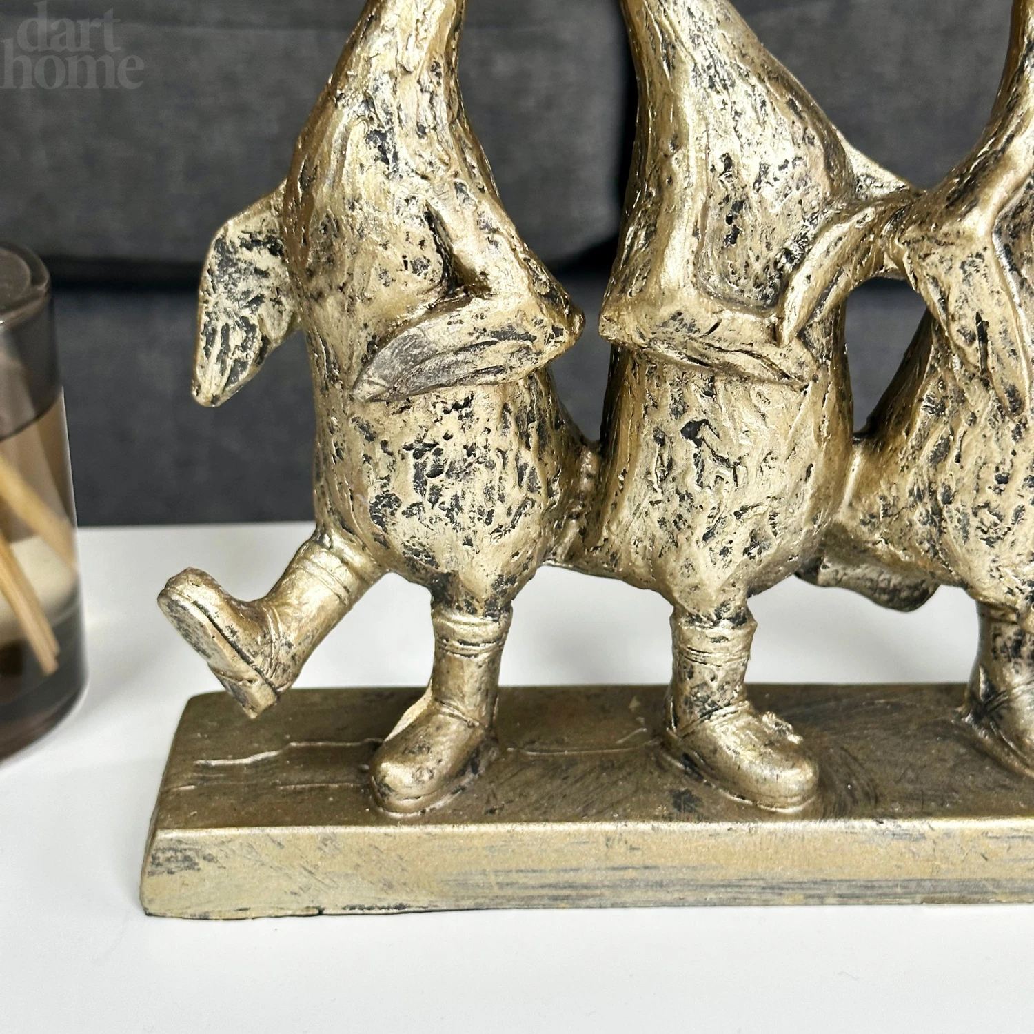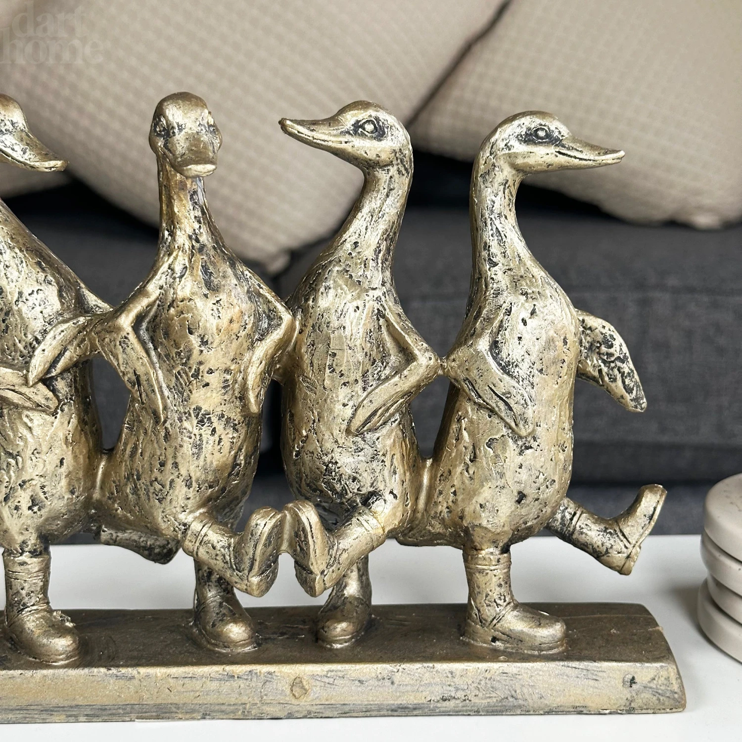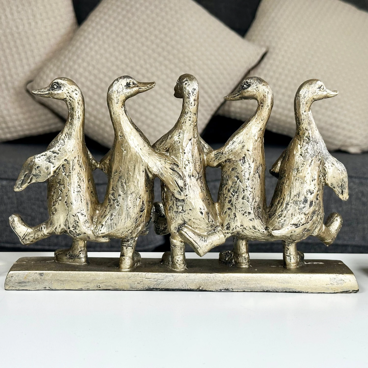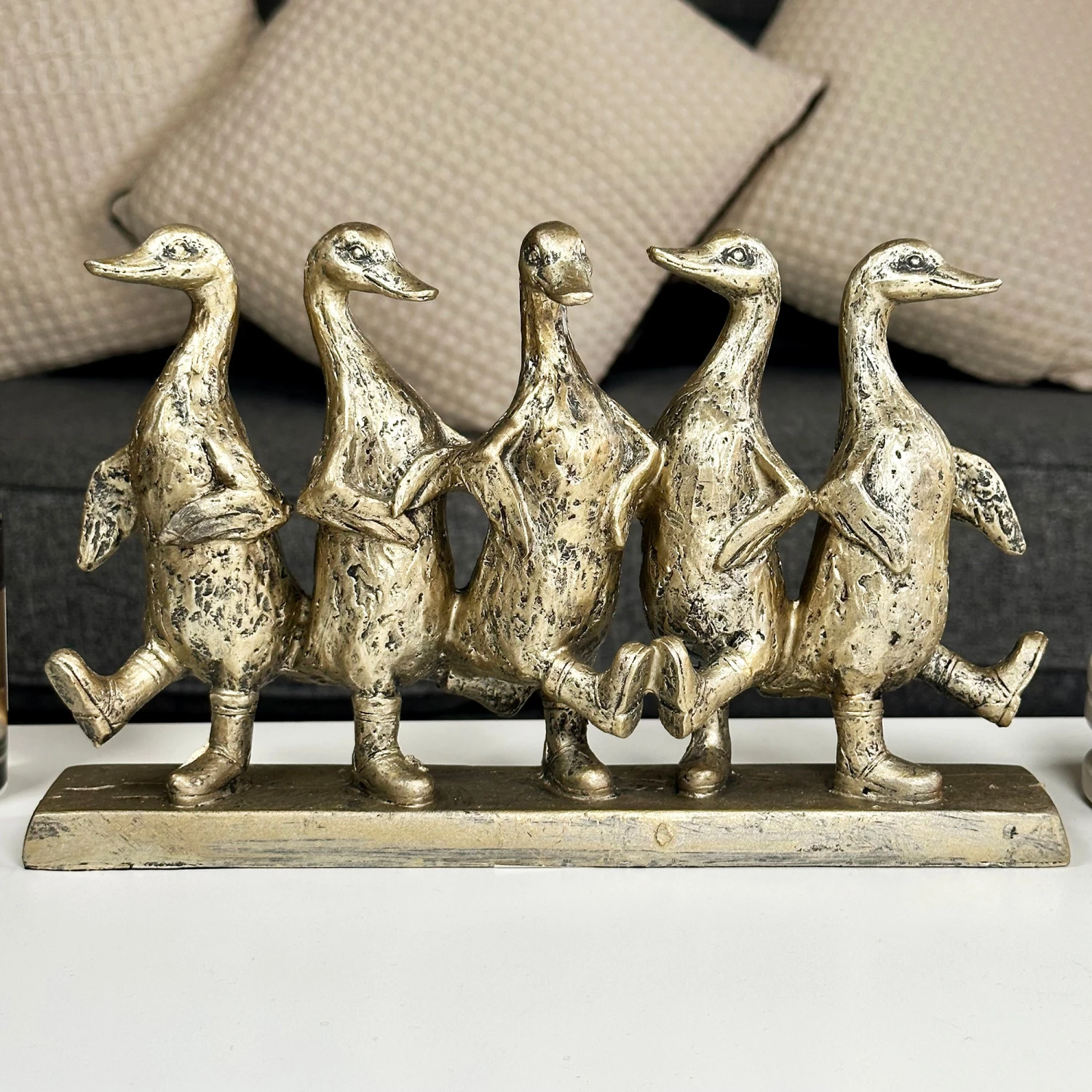 Decorate your interior with these happy dancing ducks and allow them to lift the mood of any room. In a distressed gold finish and stood upon a rectangular base, these five cheeky ducks are the perfect addition to your indoor space.