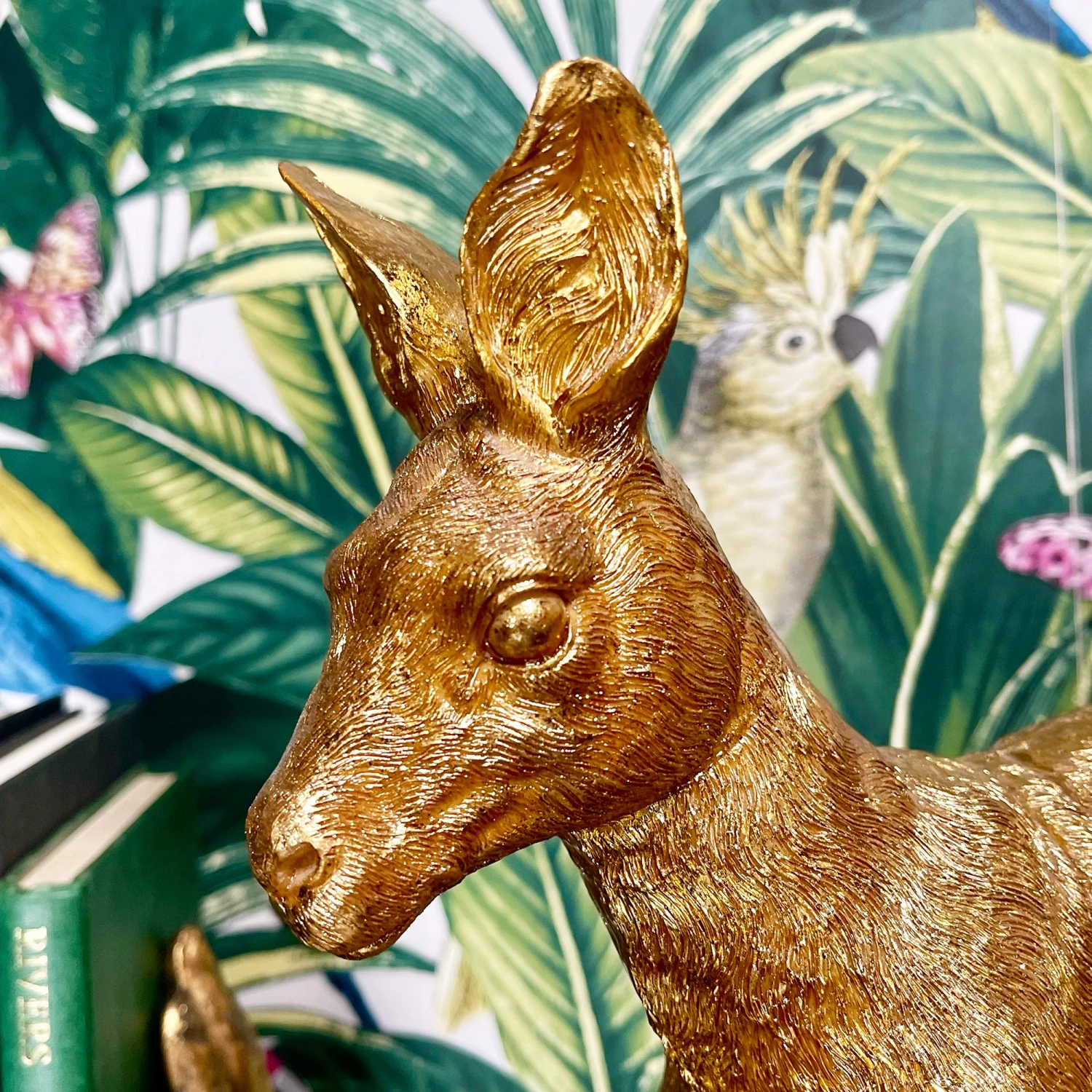 Add some eclectic colour and style into your living room with this kangaroo quirky table lamp. Also able to use a floor light, this large centrepiece with intricate detailing will be a focal point of any room. This stunning piece, finished in a warm bright gold features a standing kangaroo holding a light bulb (bulb not included). Use a max 60W E27 light bulb to enjoy a warm, soft setting in your room.