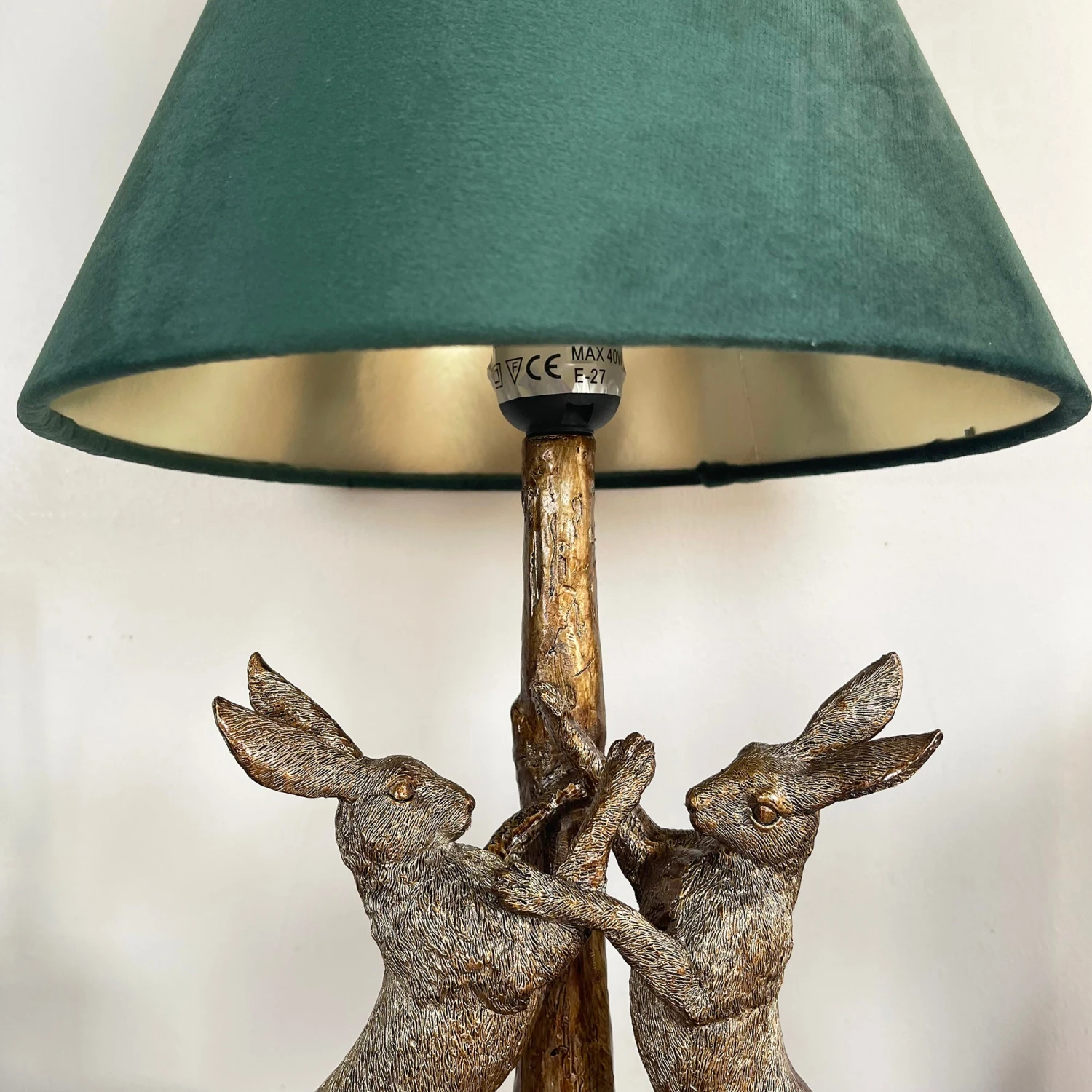 Modern style bedside table lamp perfect as a reading light. Antique gold coloured marching hare pair design made from resin with a green velvet round shade, offering a dark warm white light when the light switch is turned on. 1 Bulb capacity, wall plug-in and on/off switch to control, gold round textured stand.