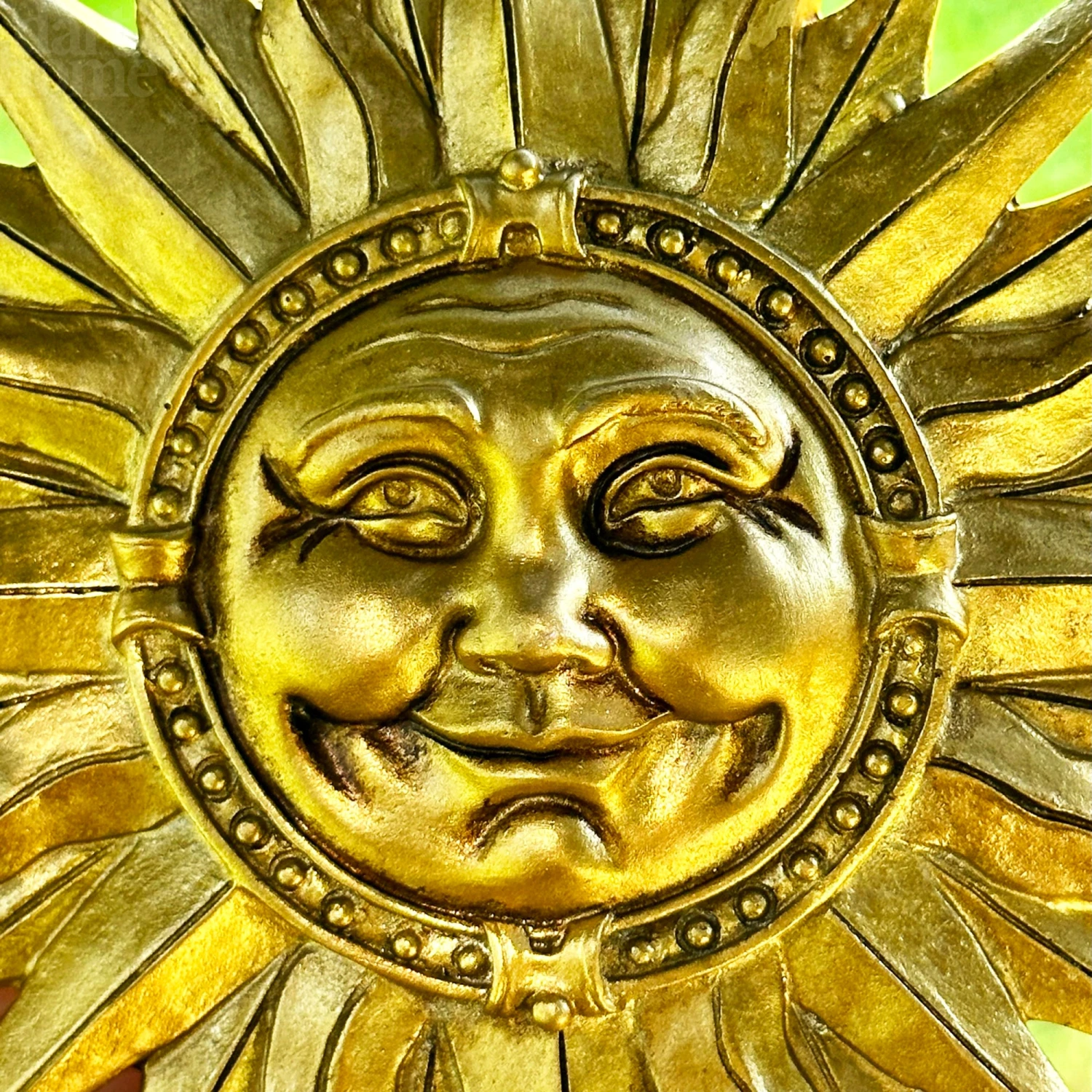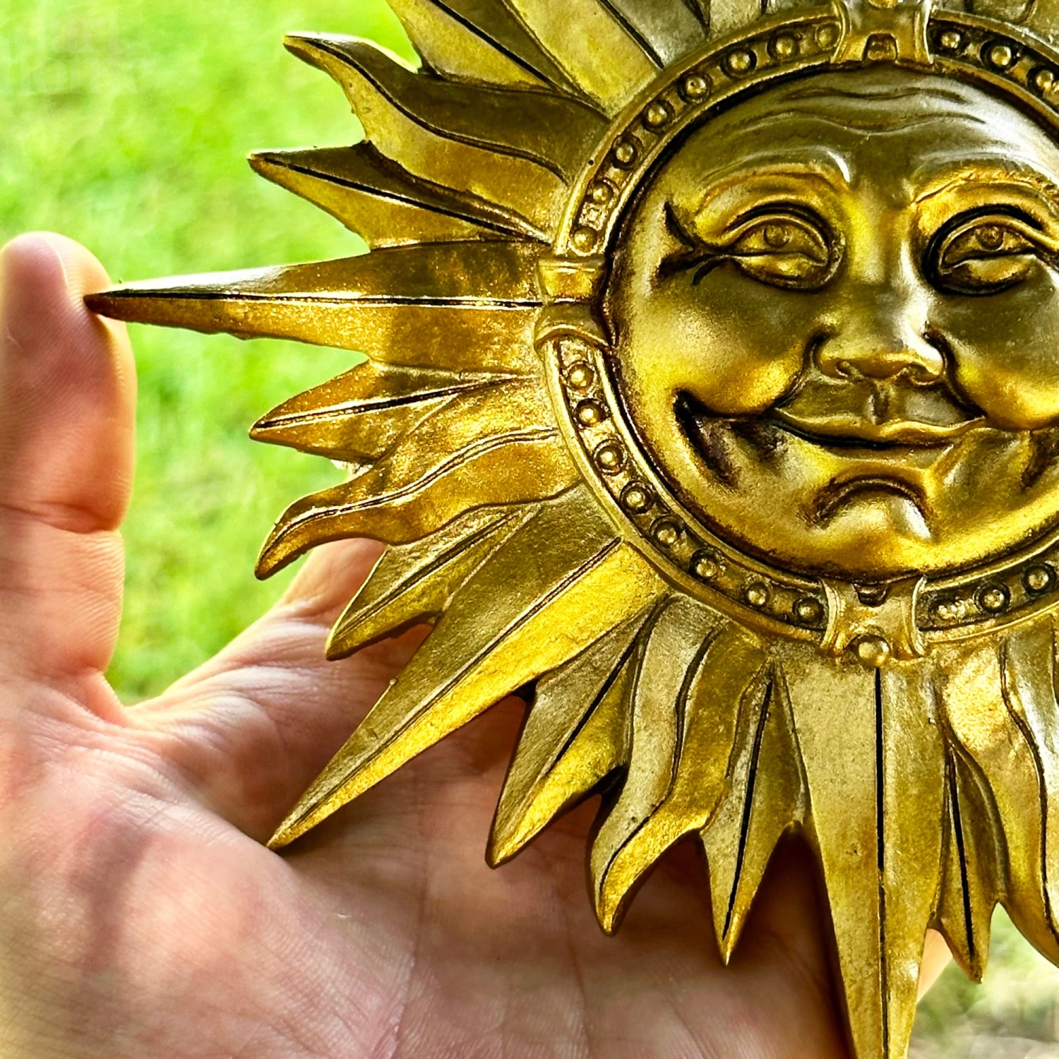 Bring an instant feeling of joy into any outdoor space with this Gold Smiling Sun Wall Plaque. Crafted from resin, its unique sunburst design will spark a sense of wonder and delight in everyone who sees it. Hang this charming piece on your wall today for a warm and uplifting addition to your home!