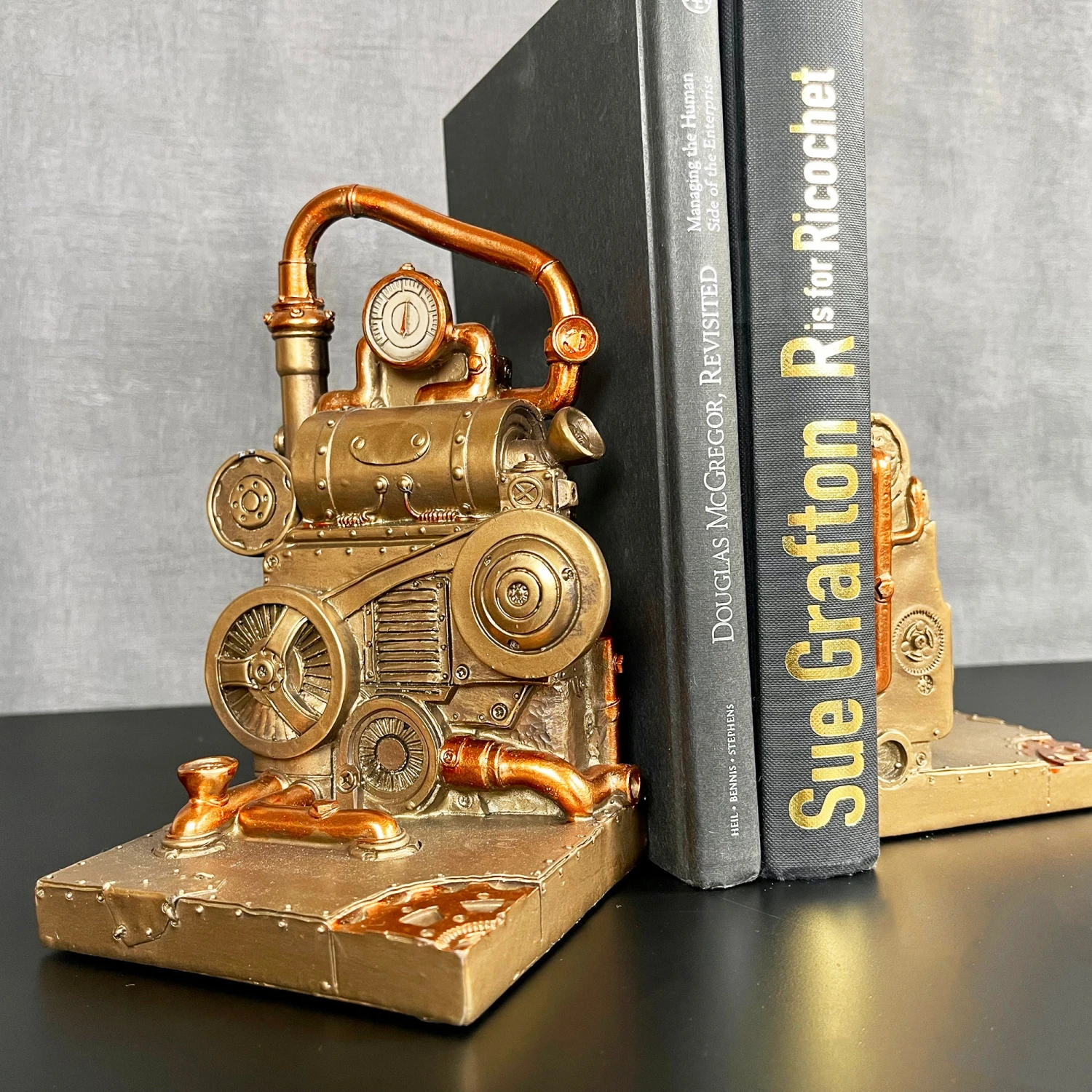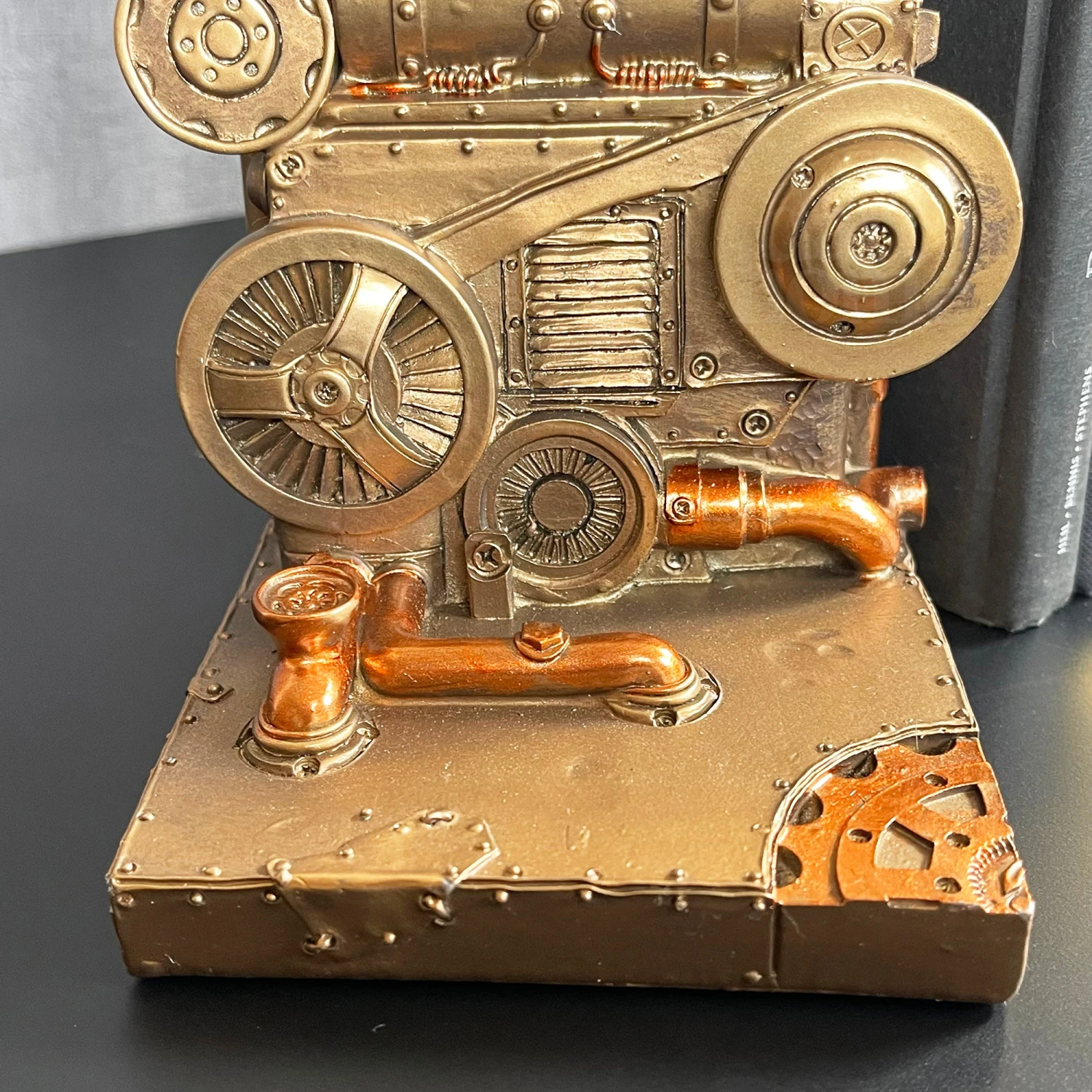 These heavy duty steampunk bookends feature a classic rectangular gothic industrial design. They are finished in a metallic gold with bronze decorative pieces and are ideal for keeping your shelves tidy and your books in place.