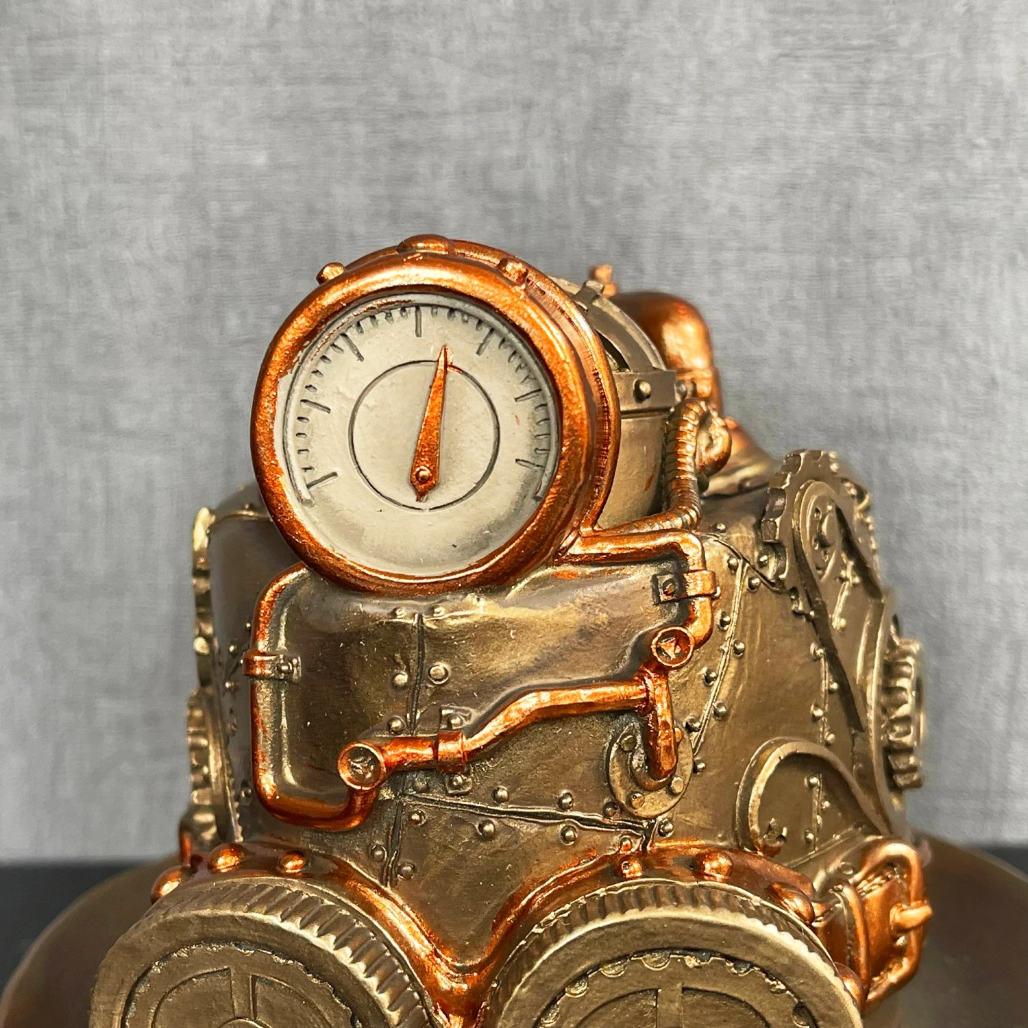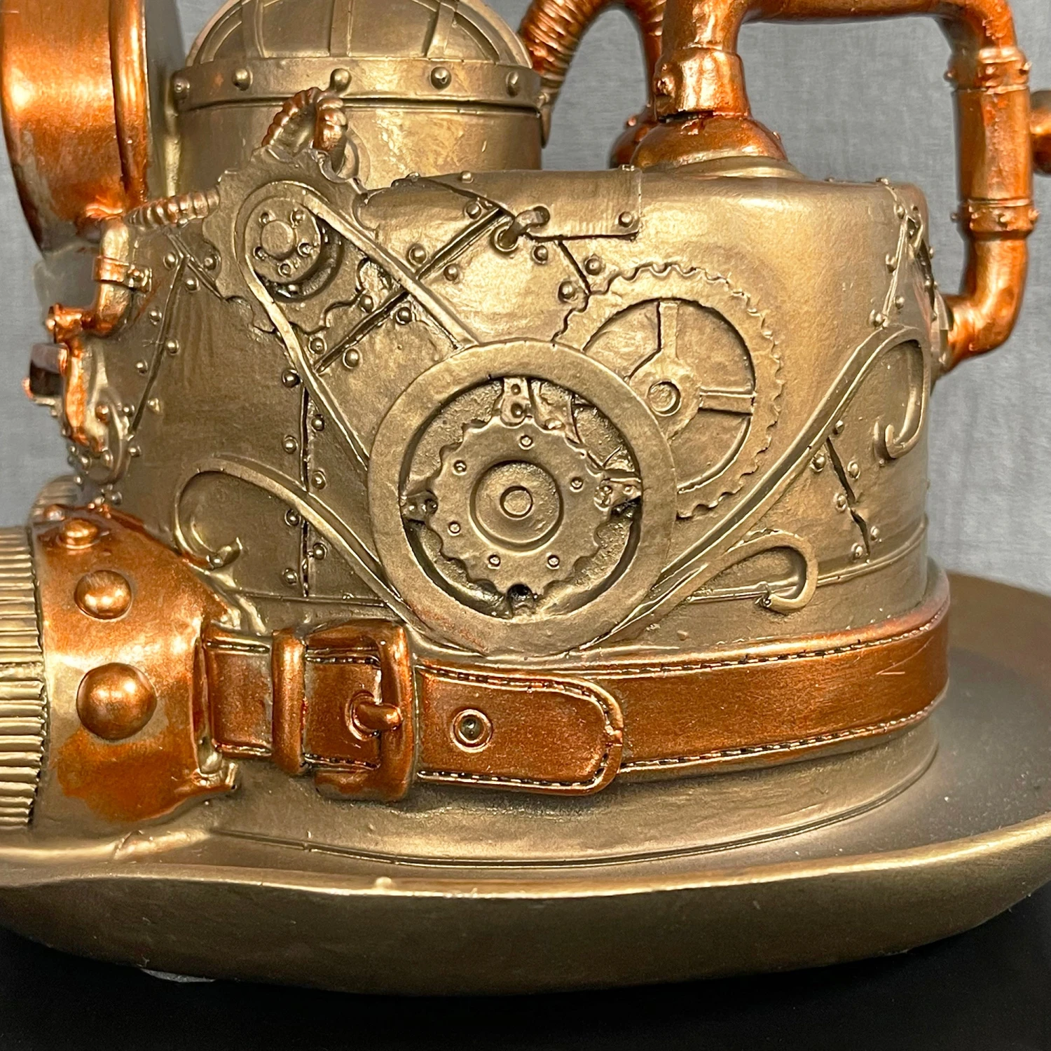 This fantastic mechanical steampunk themed top hat is made from resin with a golden finish and bronze and copper parts to complete the look. This heavy steampunk sculpture weighs just under 0.7kg and comes with a to keep the secure. It is a perfect gift idea for a sci-fi steampunk gift idea.