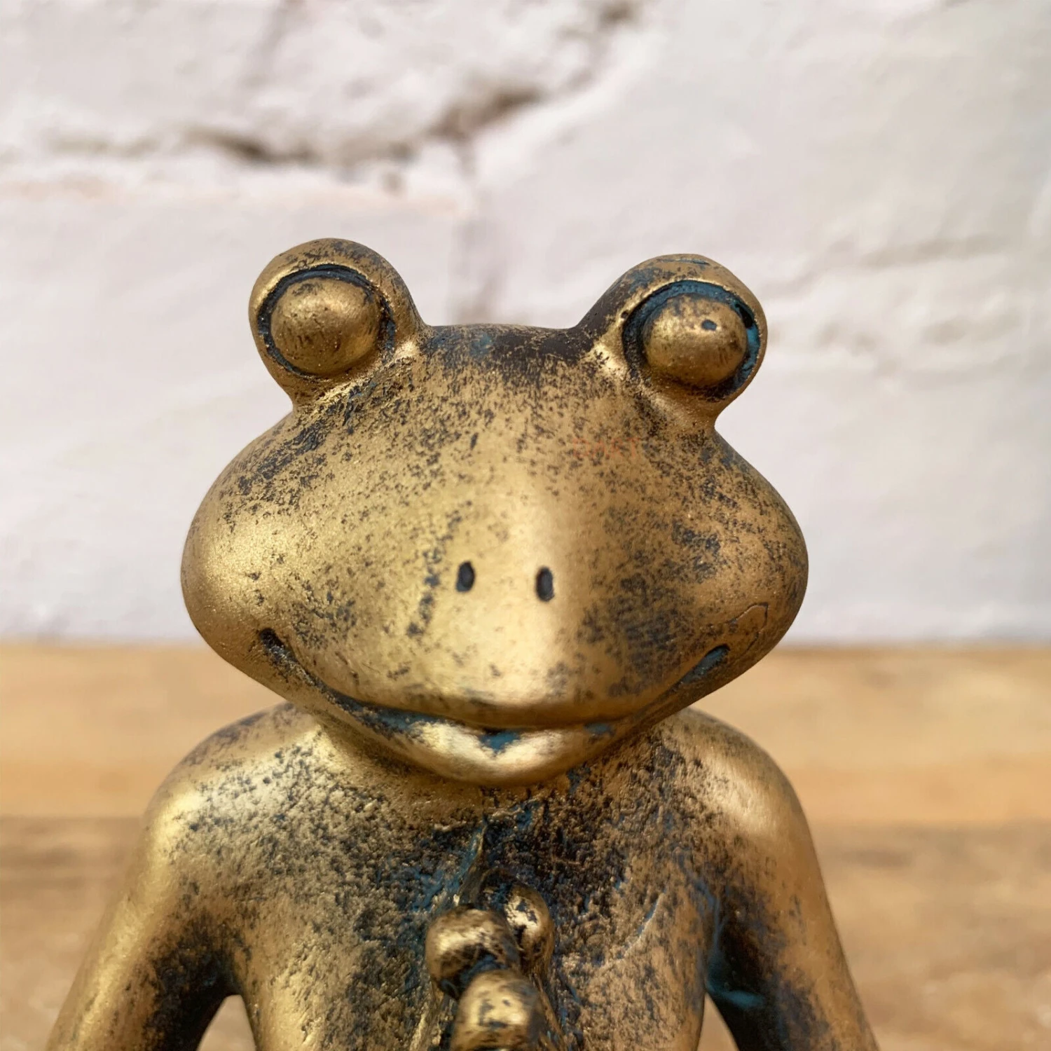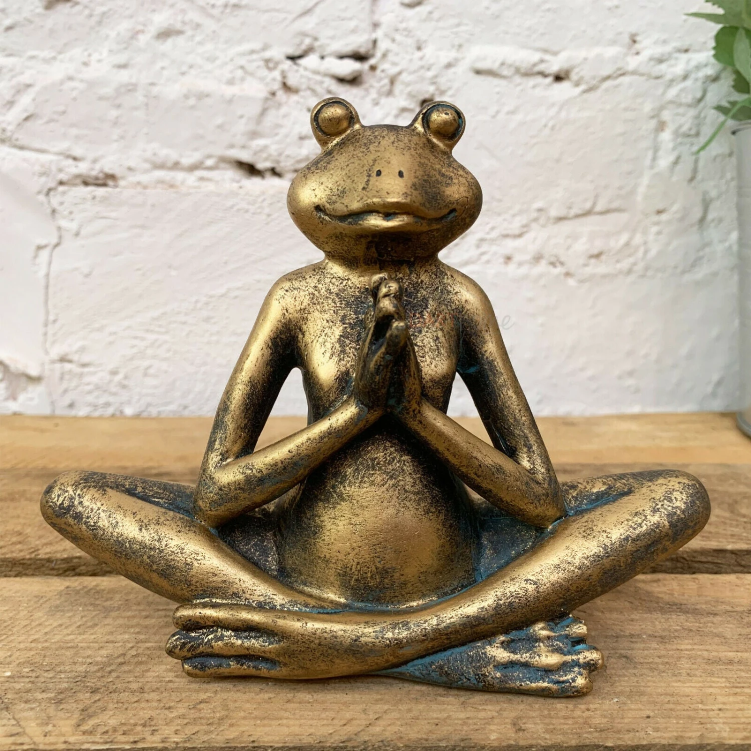 This golden sitting frog ornament in its favourite yoga pose comes in a golden distressed finish with a dark green tint. This shelf sitter is a great gift idea and a must have decorative piece for your home.
