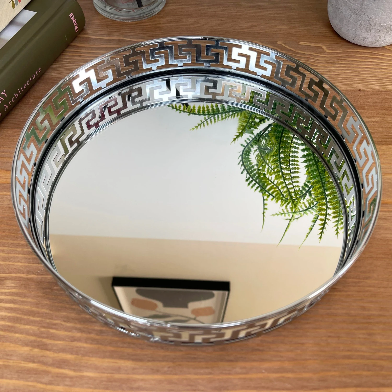 Crafted with glass and metal, this opulent silver round 21cm diameter mirrored tray boasts a classic greek key patterned metal frame and adds a vintage touch to this modern decorative candle tray. Also available in large 31cm diameter.