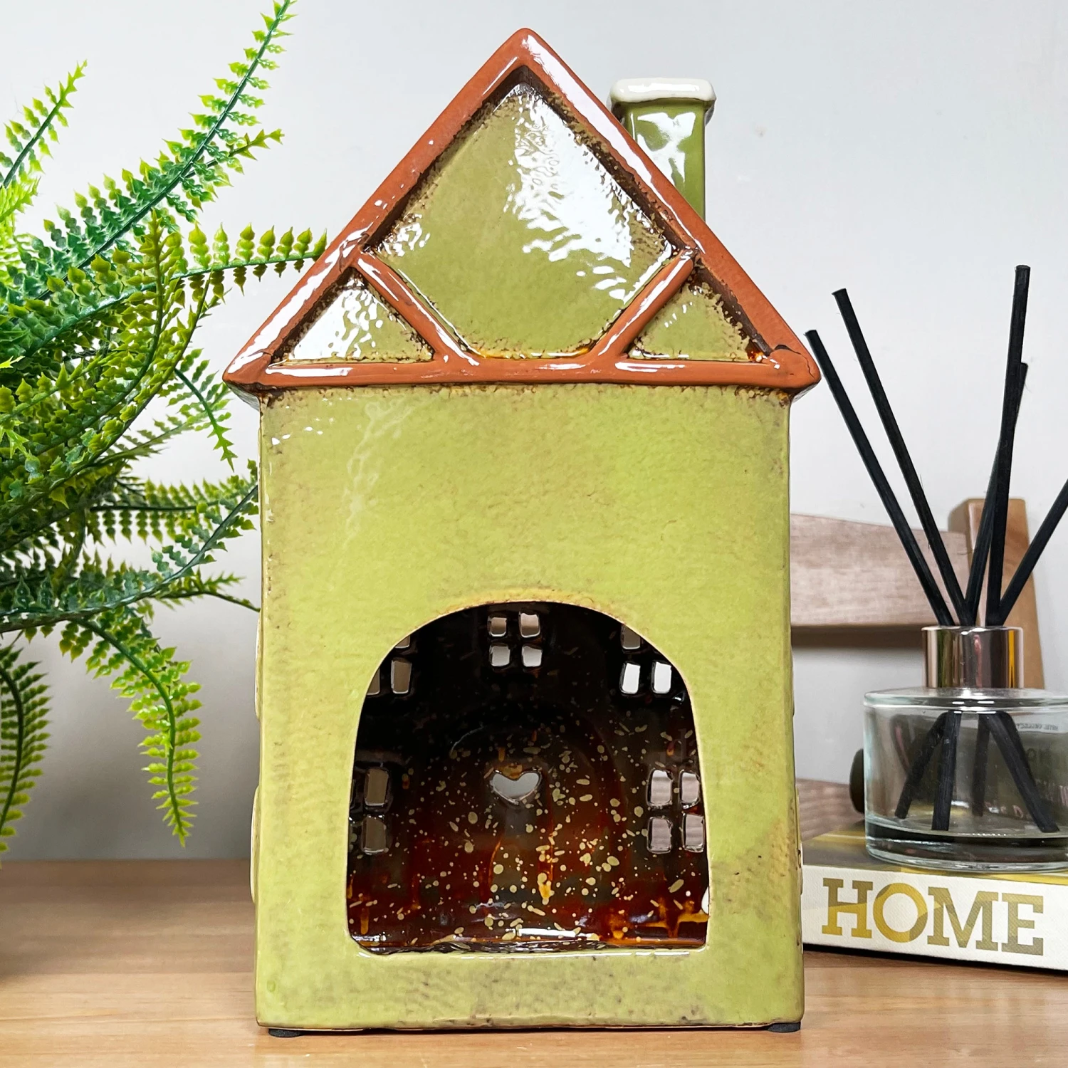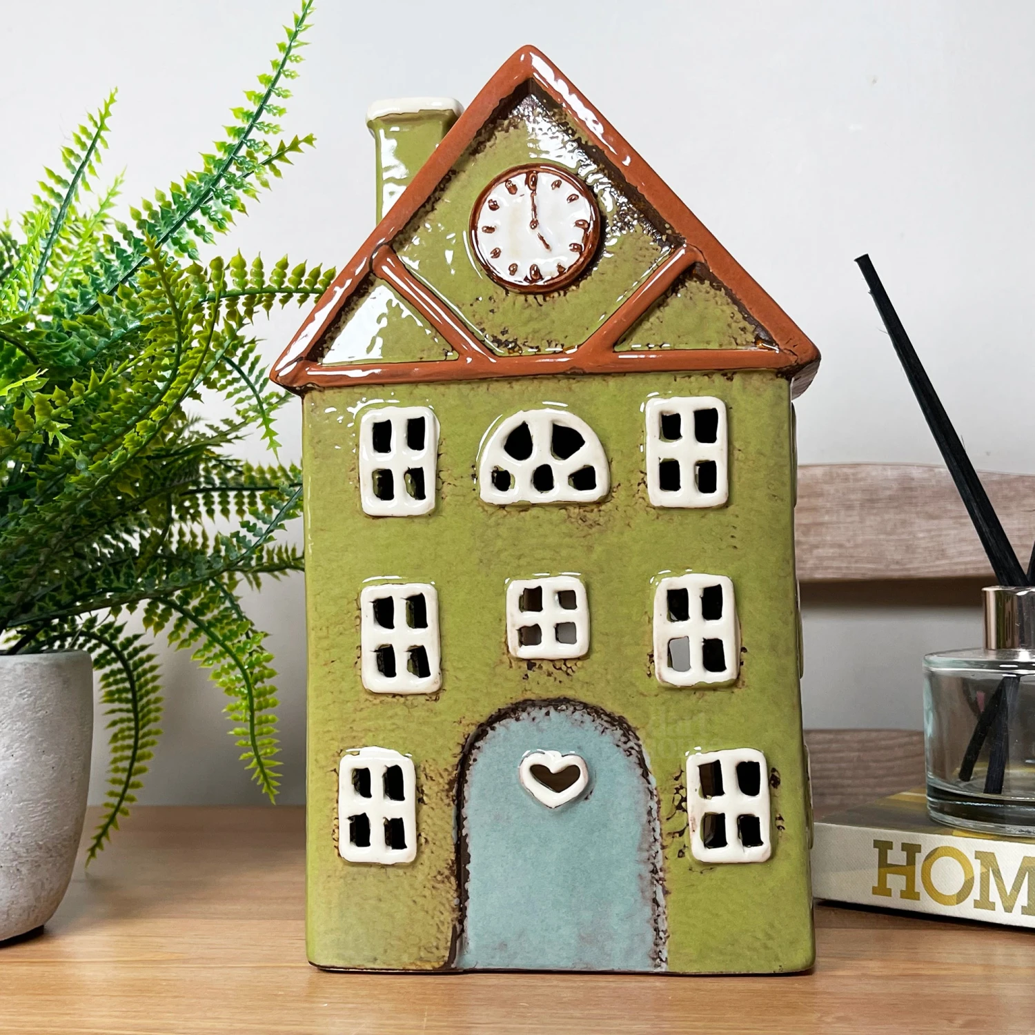 Stunning clock tower house featuring olive green walls and finished with a dark brown roof and blue love heart door. This elegant country style piece acts as a tea light holder that will glow when the lights are dimmed, offering a sense of calm and warmth wherever placed. It is made from glazed ceramics and is suitable for tea lights and indoor use only. It is a must have contemporary piece of home decor for your home.