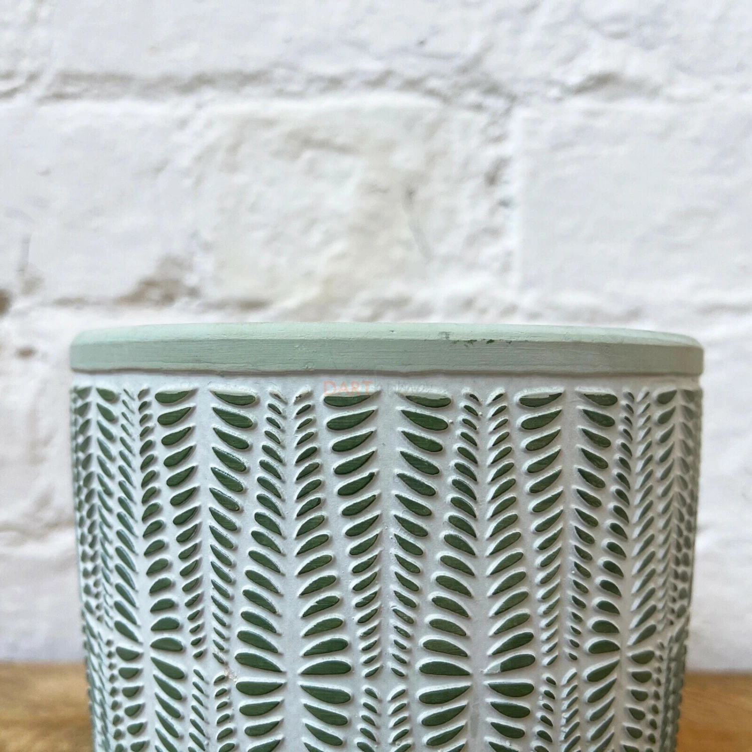 This round indoor & outdoor plant pot has a distressed green finish and is decorated with an embossed diamond geometric pattern. The planter will look great in your home and garden.