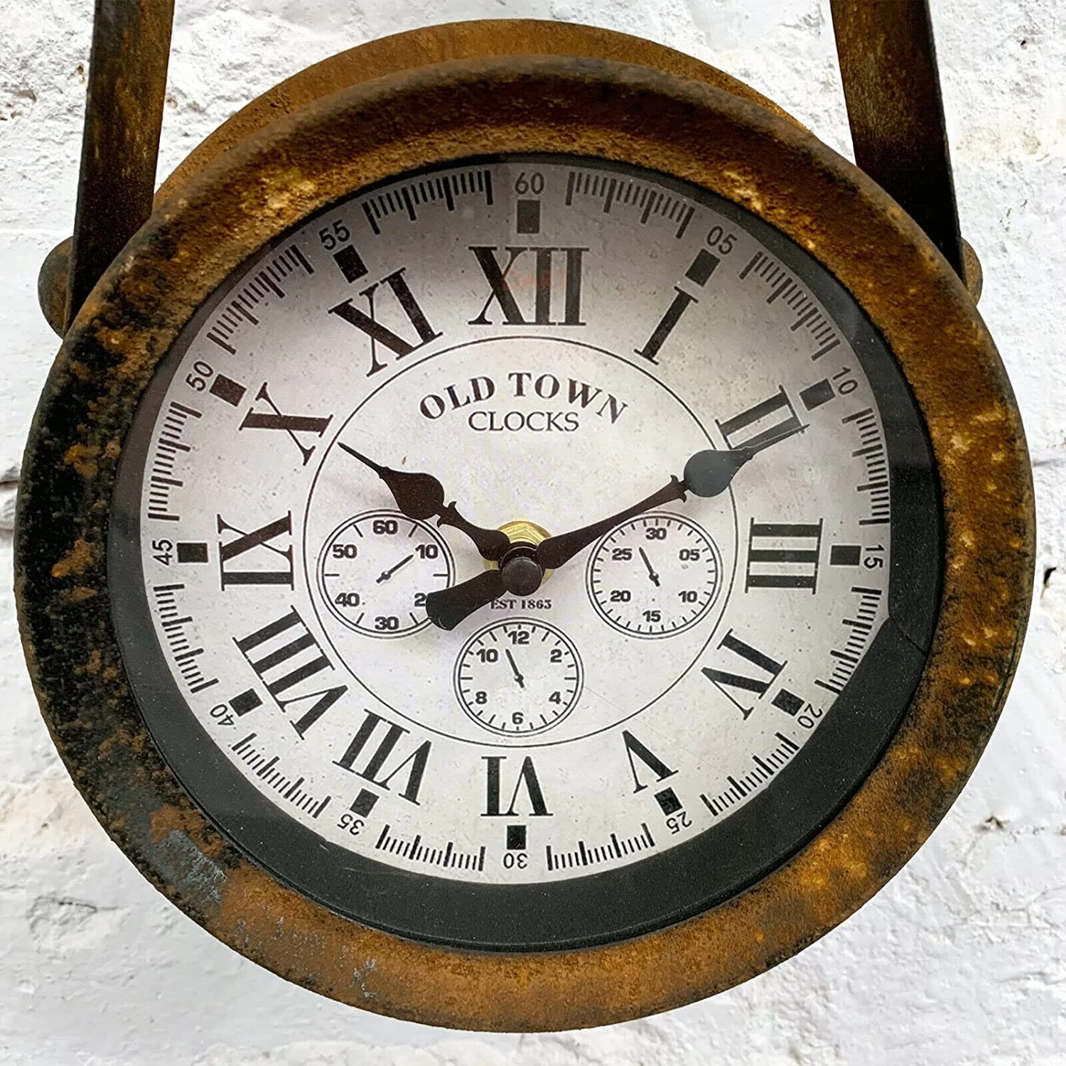 Features: Roman Numerals, 12 Hour Display, Wall Mounted, Rusted, Round Analogue, Battery Powered, Antique Style