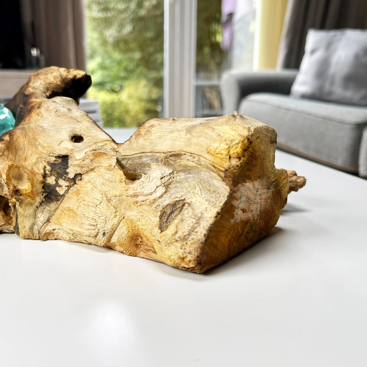 This beautiful handmade double tea light candle holder is made from molten glass that is melted onto the teak root wood stand, giving it that melting effect that makes the piece so stunningly unique. The natural rustic teak root is hand carved and will look perfect in your home.