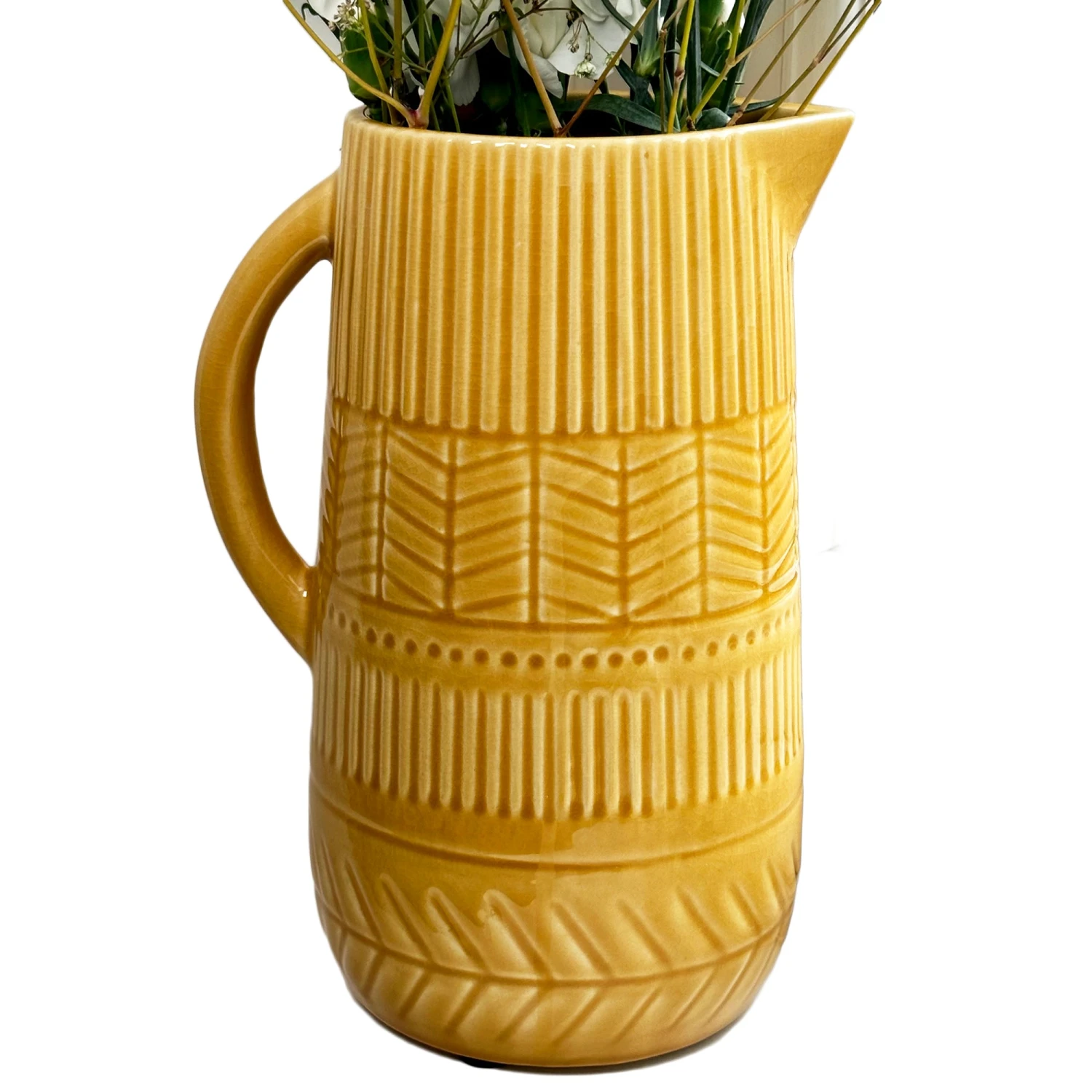This mid century modern style jug vase with a retro assortment of patterns including chevrons, lines and dots is perfect for holding floral arrangements to enhance wedding or kitchen table decoration.