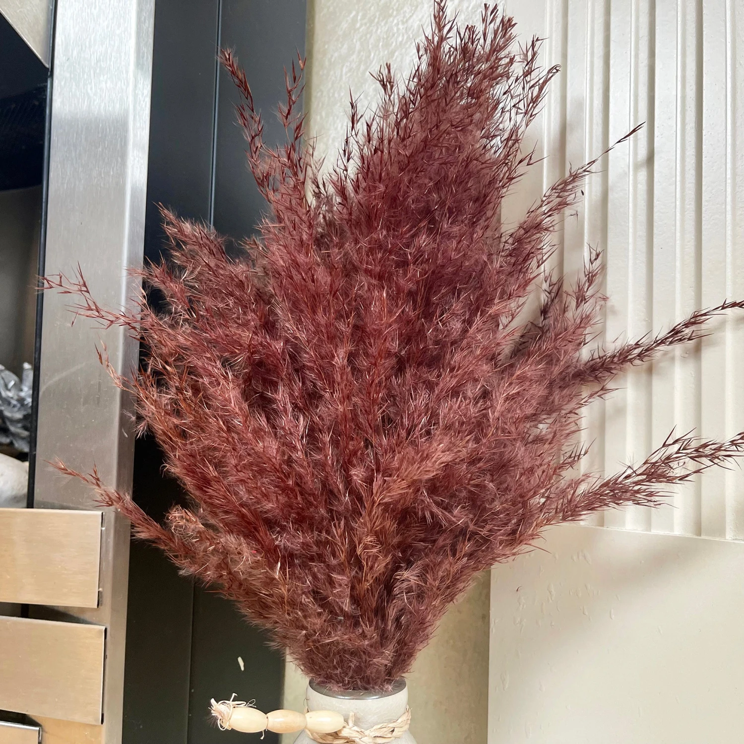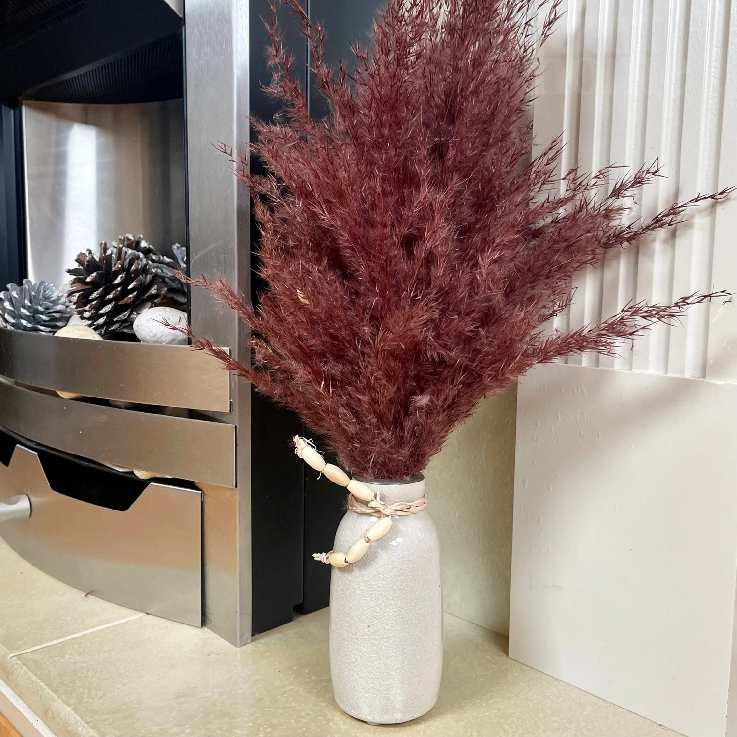 Real red dried pampas grass in a crackled ceramic vase. A colourful fluffy houseplant that will brighten a wedding or dining table with ease and instil natural style to your interior.