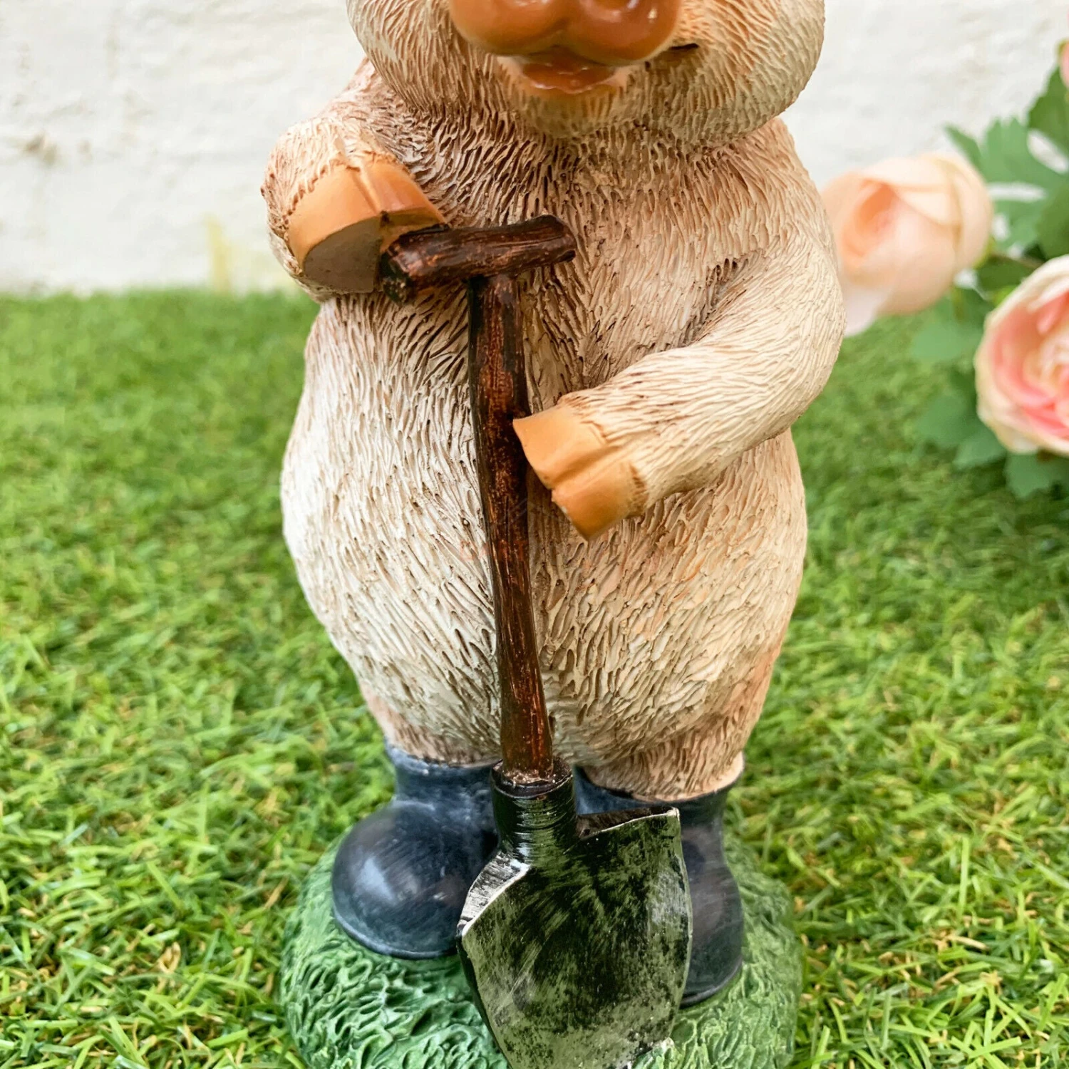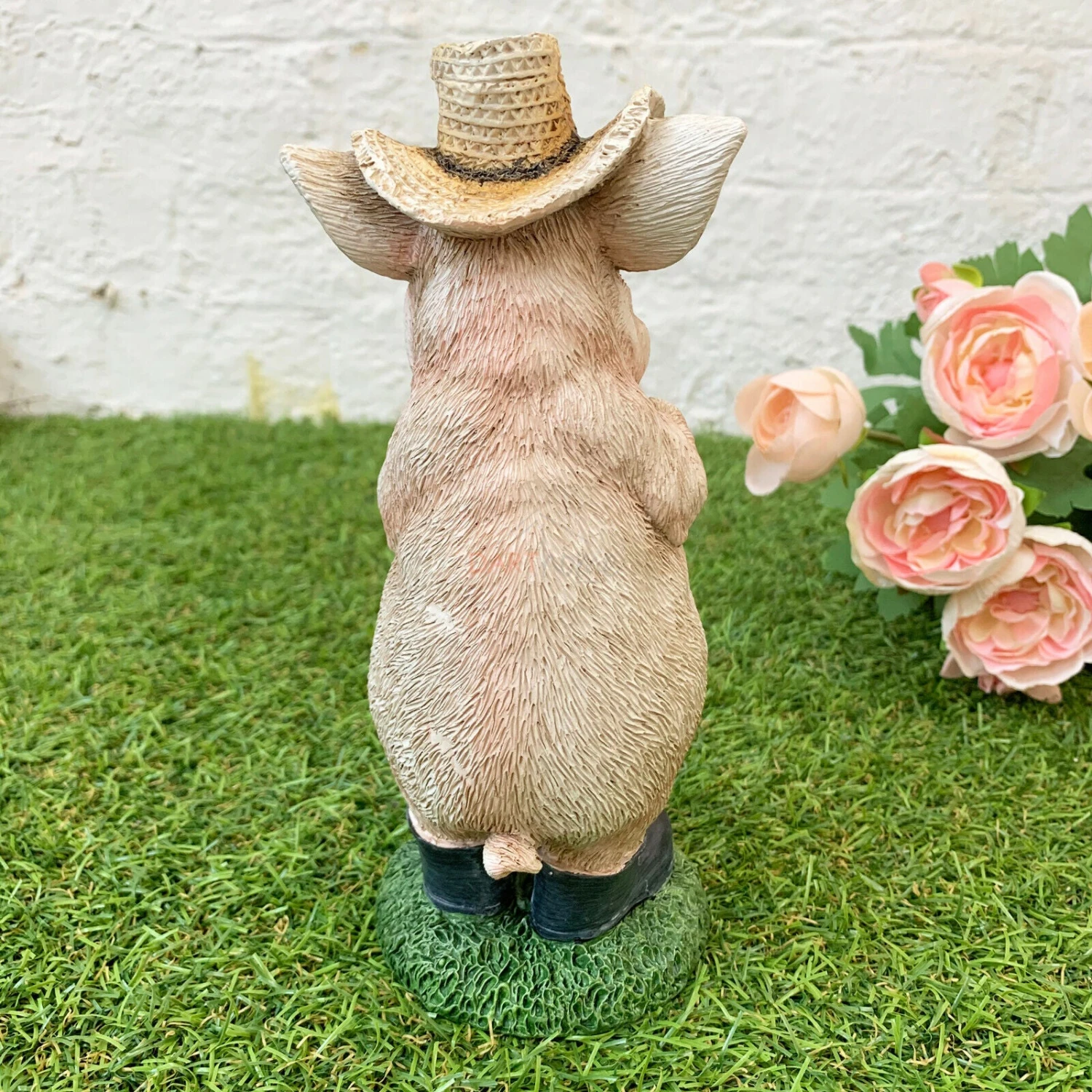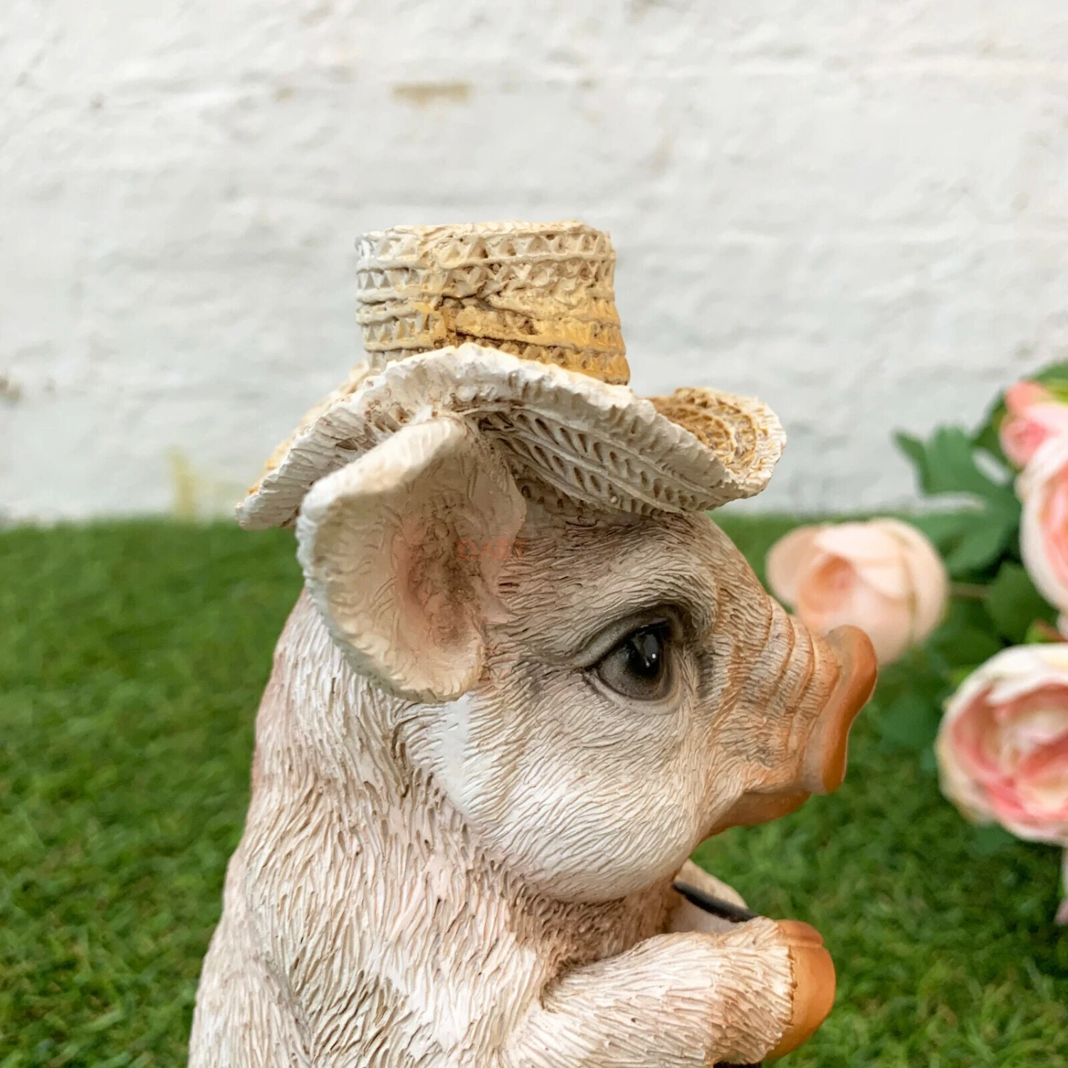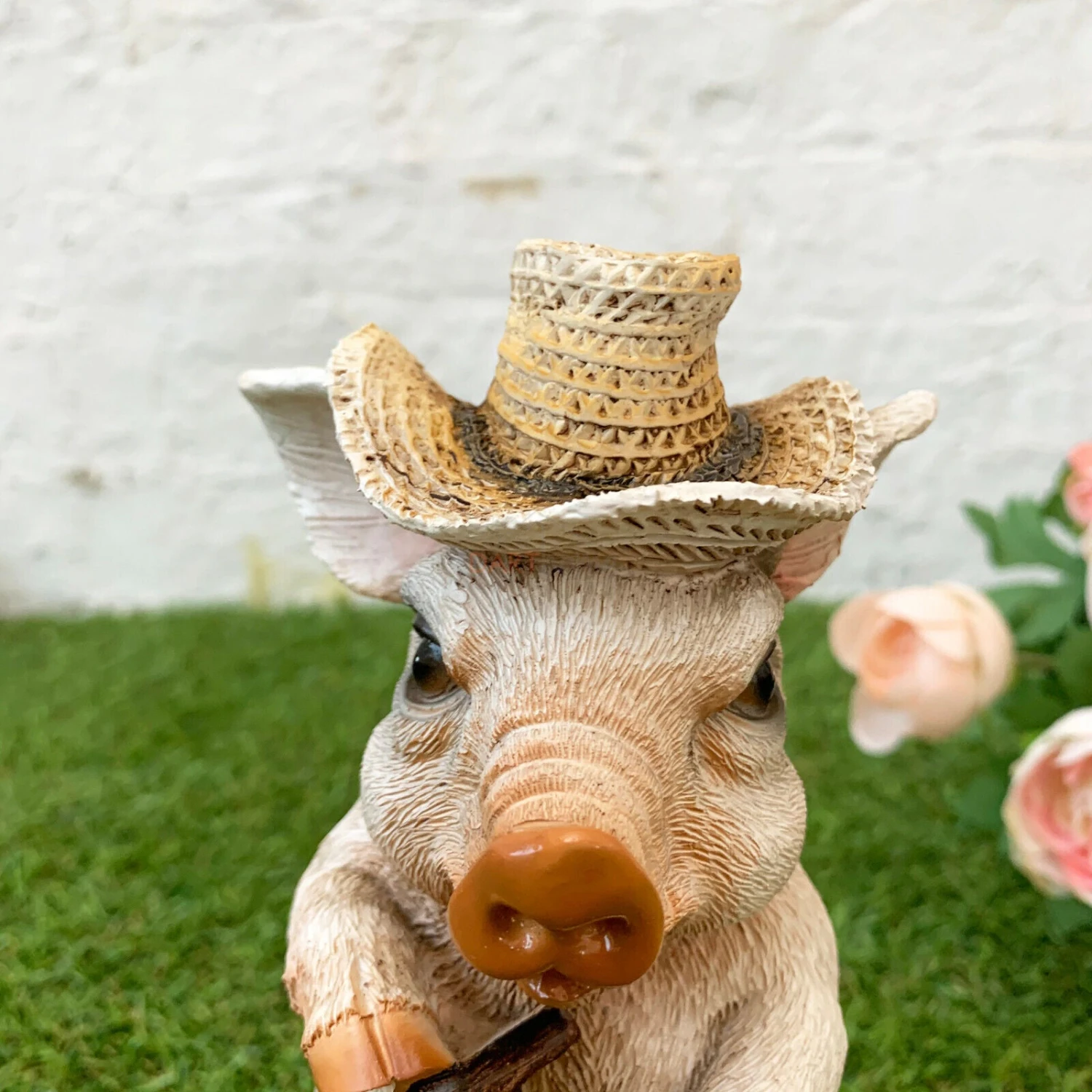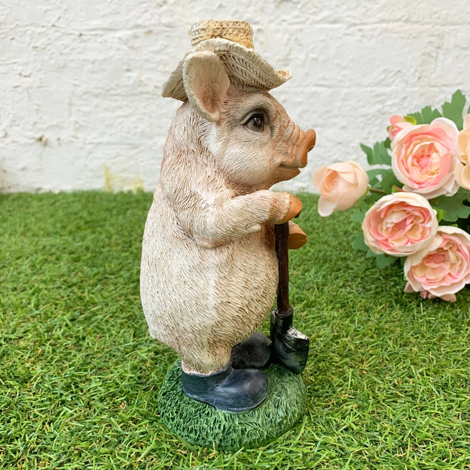 This pink pig is freestanding and made from resin. The design showcases a pig in their straw hat doing some gardening. The weather resistant resistant resin makes the pig ideal for indoor and outdoor use. The sculpture would look great in your home, garden, on your lawn or patio.