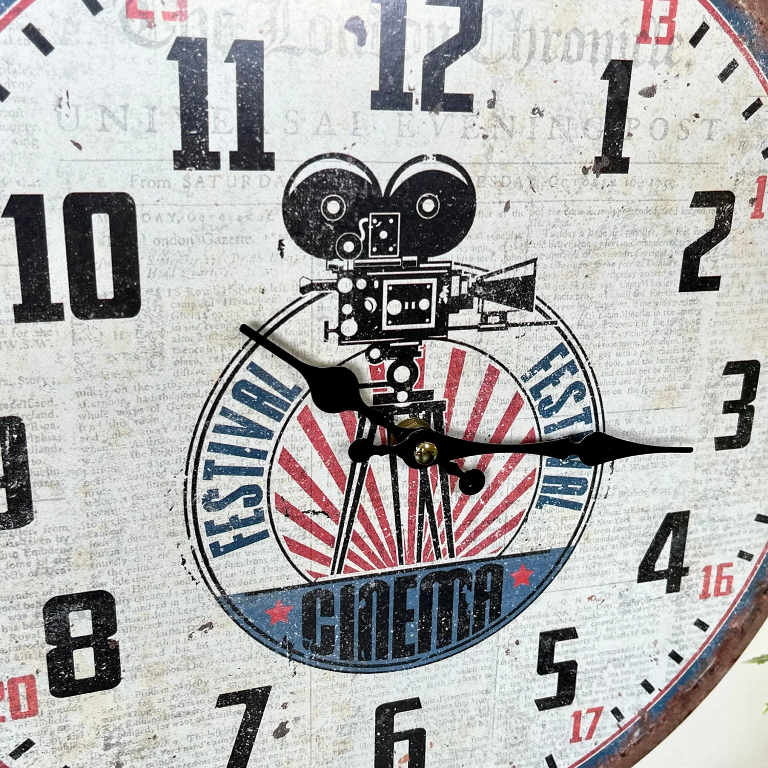Clock design is a movie camera from the film festival with a standard 12 hour display. Distressed finish on both. Wall Mounted clocks that are battery powered. Batteries not included.