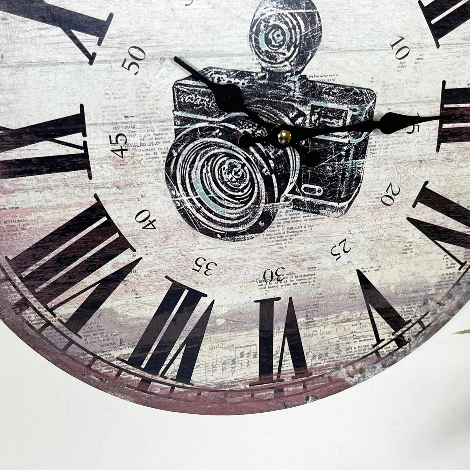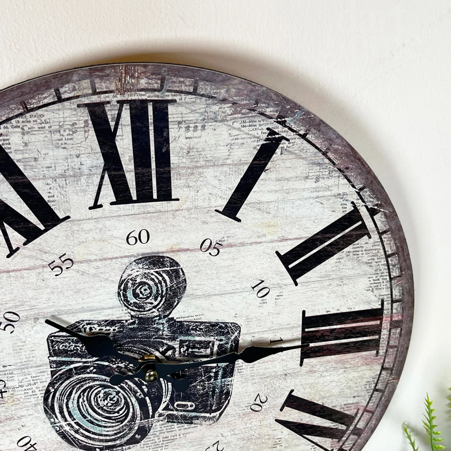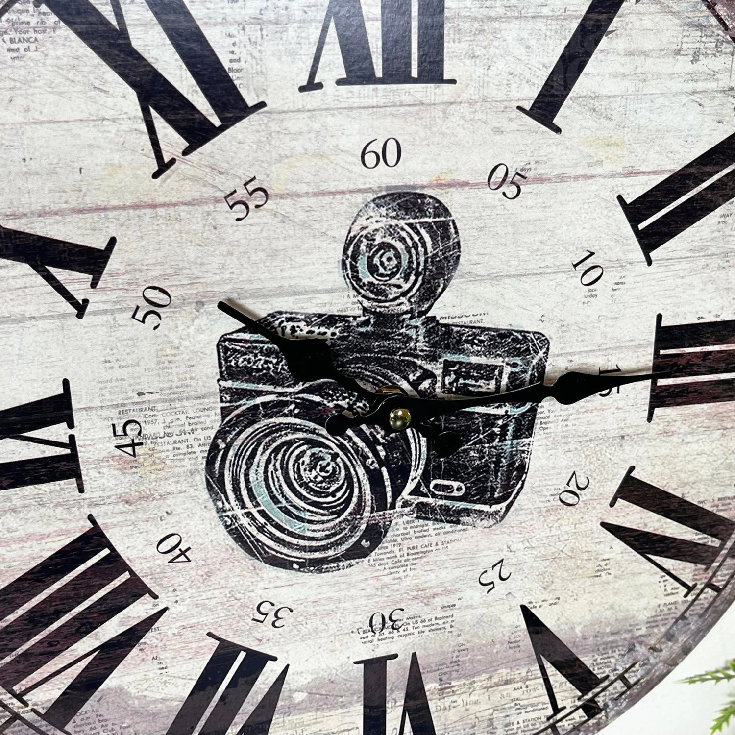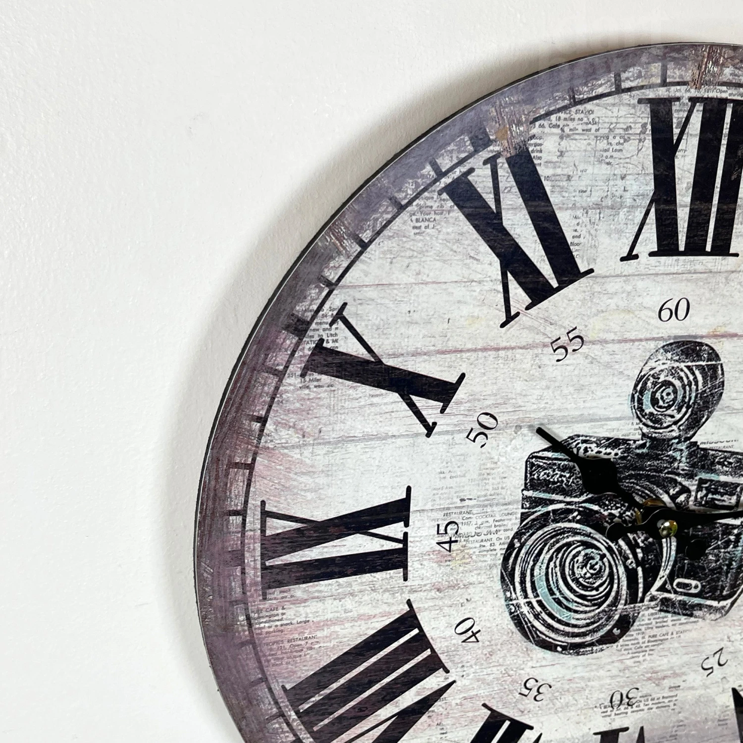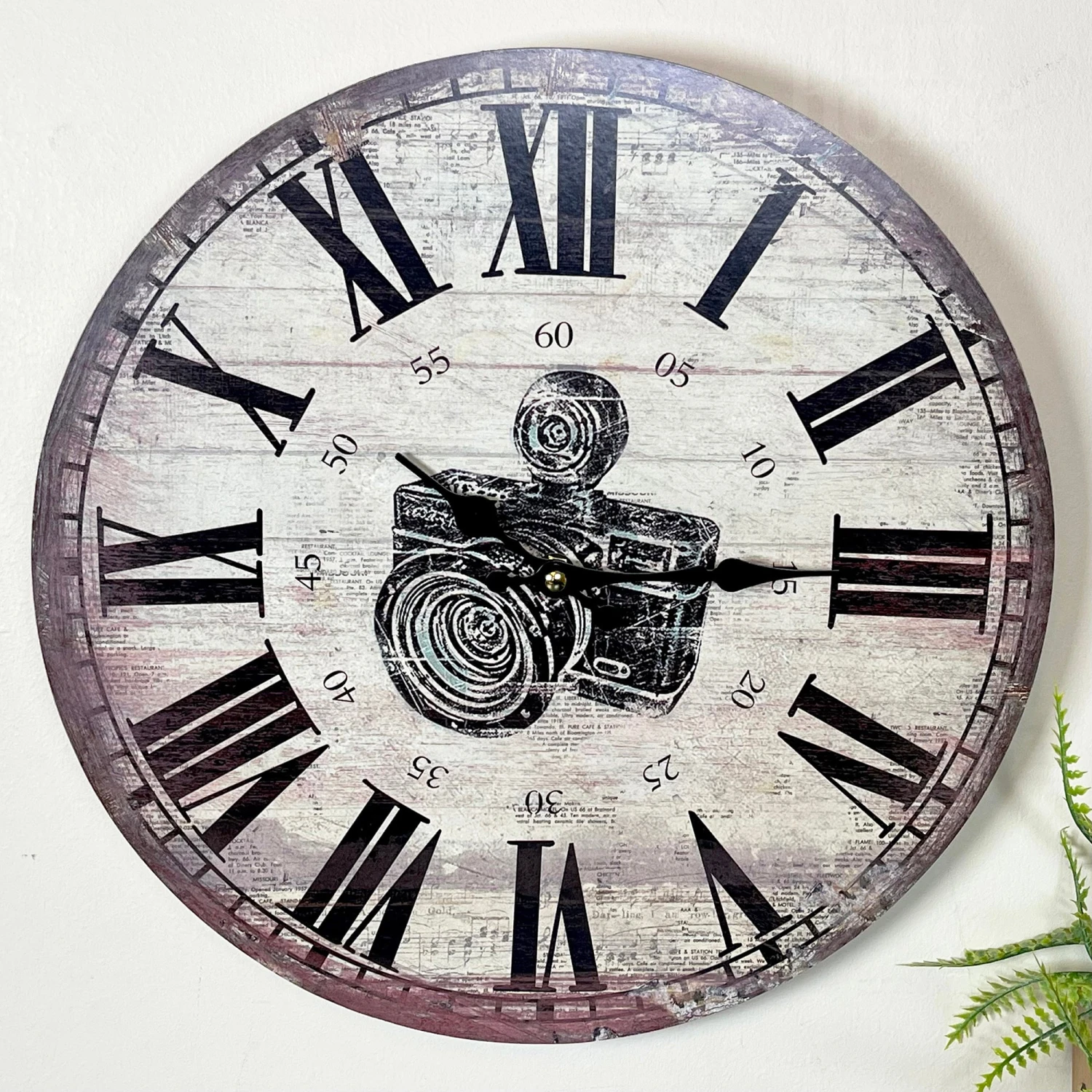 First clock design is a picture camera with a roman numeral display. Distressed finish on both. Wall Mounted clocks that are battery powered. Batteries not included.