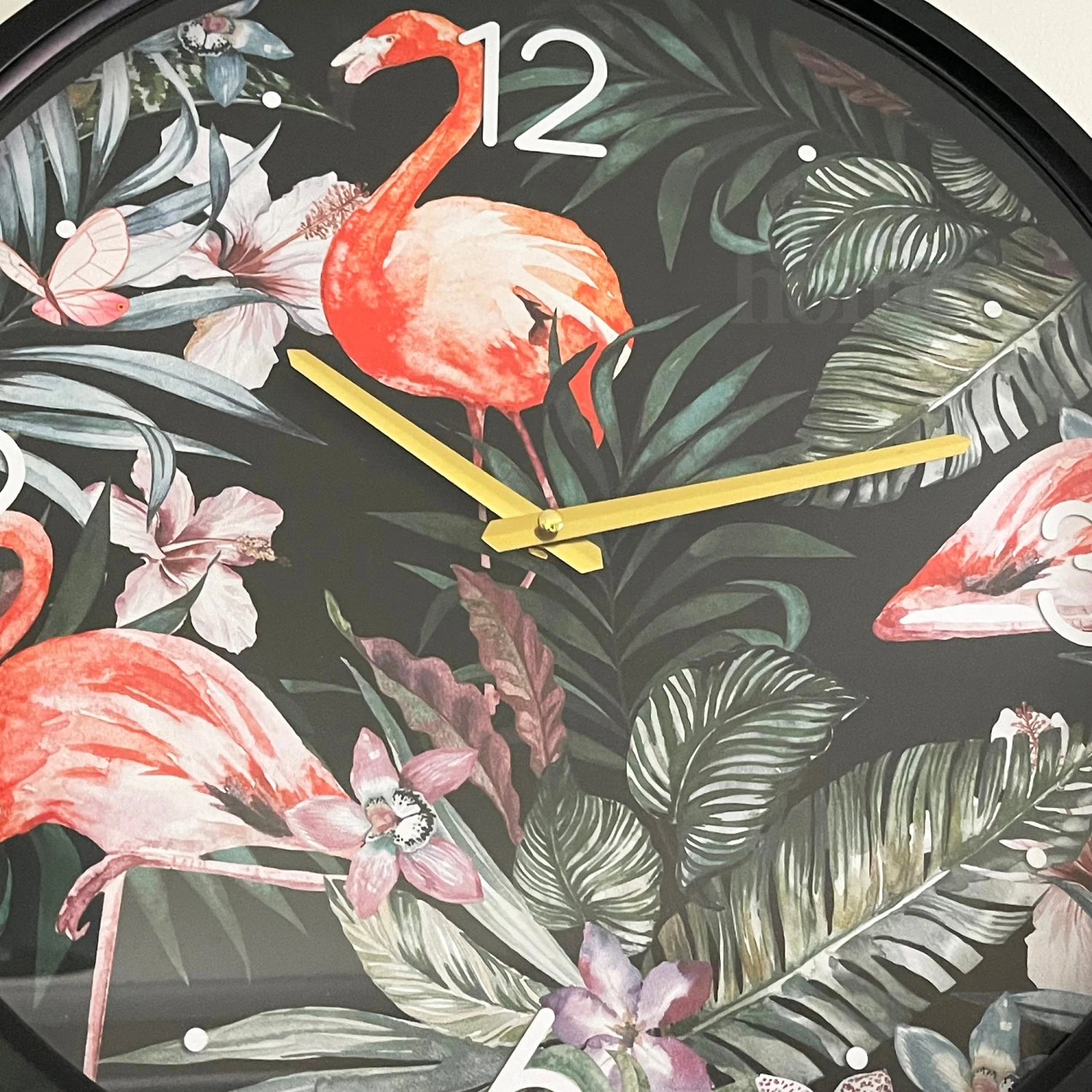 This modern wall mounted clock boasts a tropical flamingo face design. This is a wall mounted battery powered clock with a round face and is suitable for indoor use only.