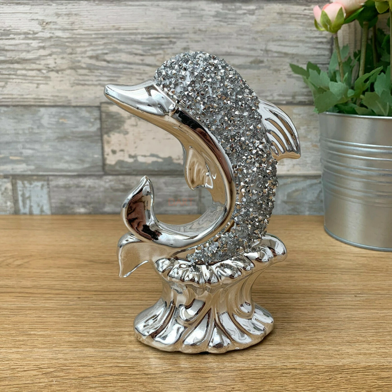 This chrome silver sparkly single dolphin ornament is decorated with small glass diamante crystals and will be a great shelf sitter for your home and would be a perfect gift idea for your animal loving friends.