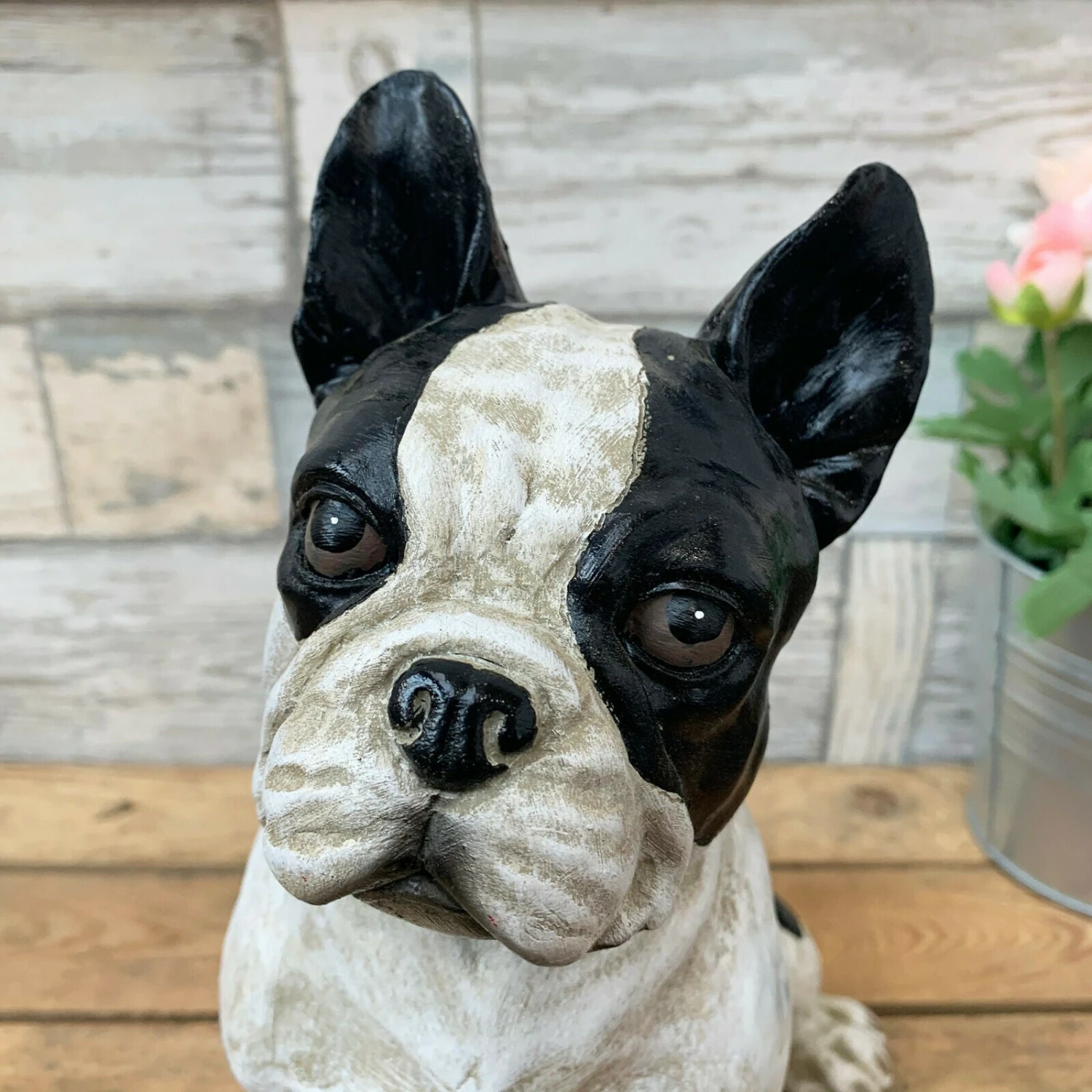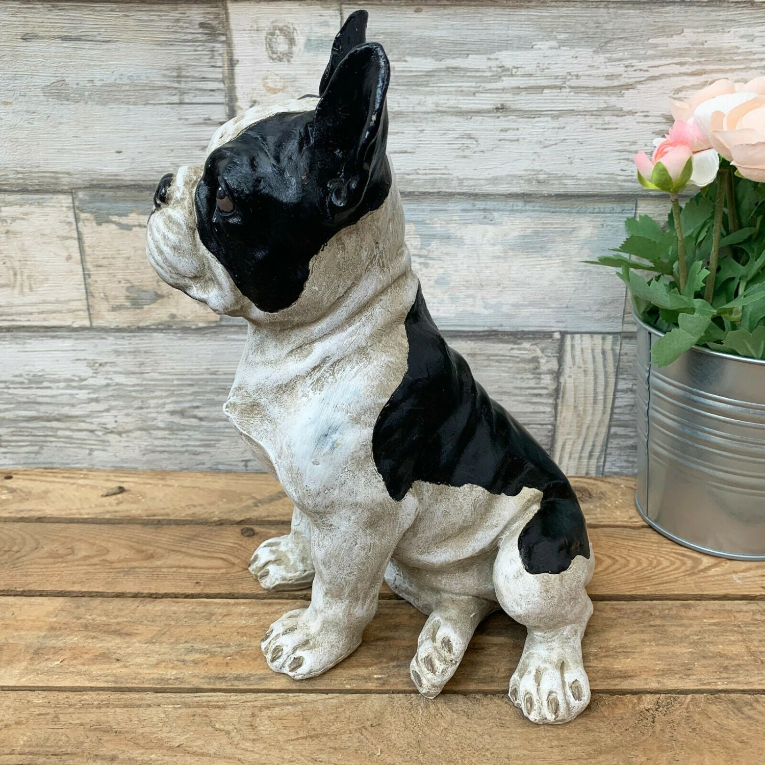 This beautiful black & white sitting french bulldog is an ideal gift for the dog and animal pet lovers out there. Made of resin with complex detailing, it can sustain the outdoor weathers and sit freely in your home or garden.