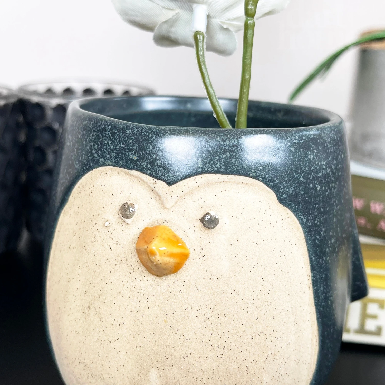 This cute penguin plant pot cover comes in a coloured blue and white design with a speckled finish. This round plant pot is an indoor only decorative pot perfect for small succulents or flowers that adds character to any room.