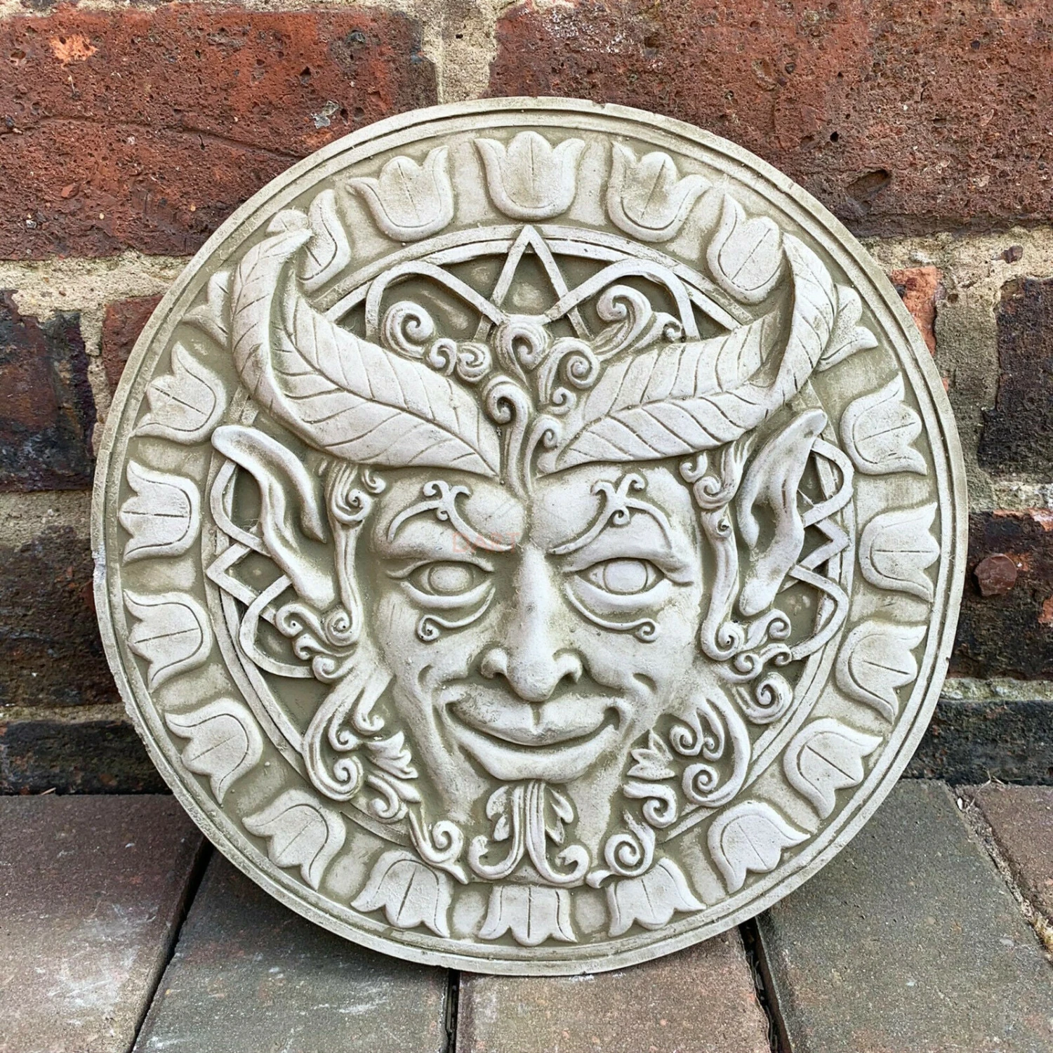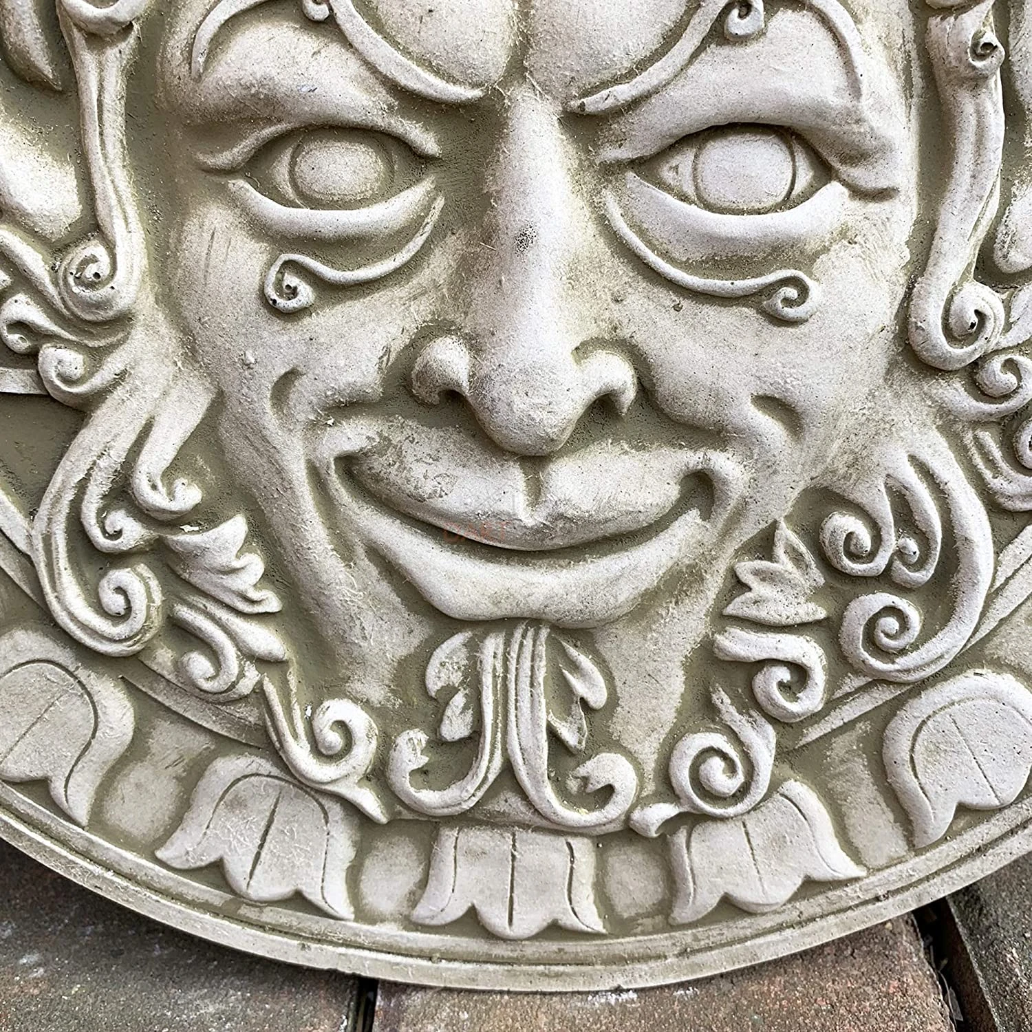 - Features: Frost-protected, Weatherproof, Wall Hanging, Outdoor, Smiling Ancient Green Man Face, Ancient Greenman, Round Abstract Art