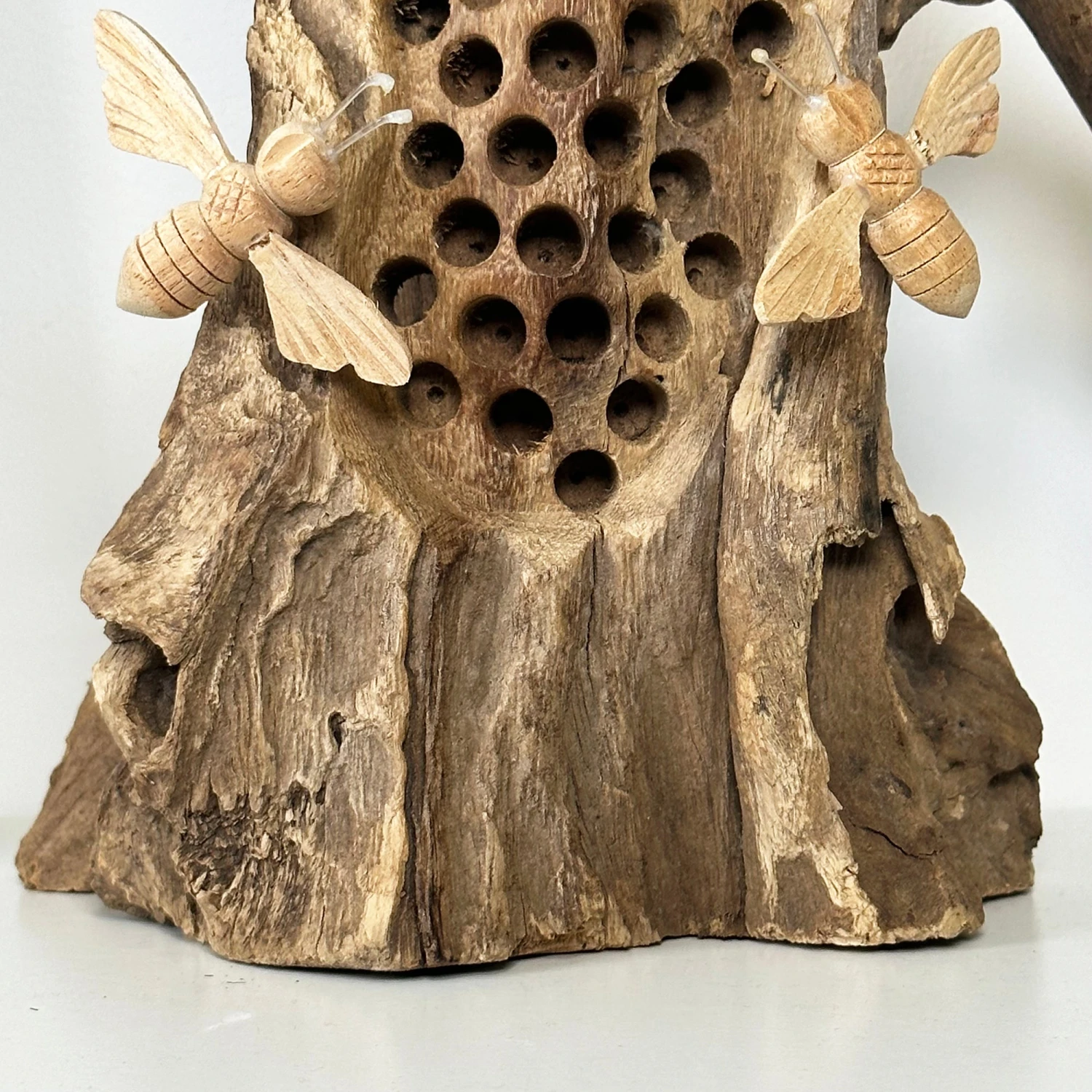Beautify your home or office with this stunning teak root beehive sculpture. Hand-carved from rustic teak root wood and crafted with intricate detail, this unique piece features 3 hand-carved honeybees to add an eye-catching delight. Perfect for a special gift or a delightful decoration, this piece is sure to make a statement!