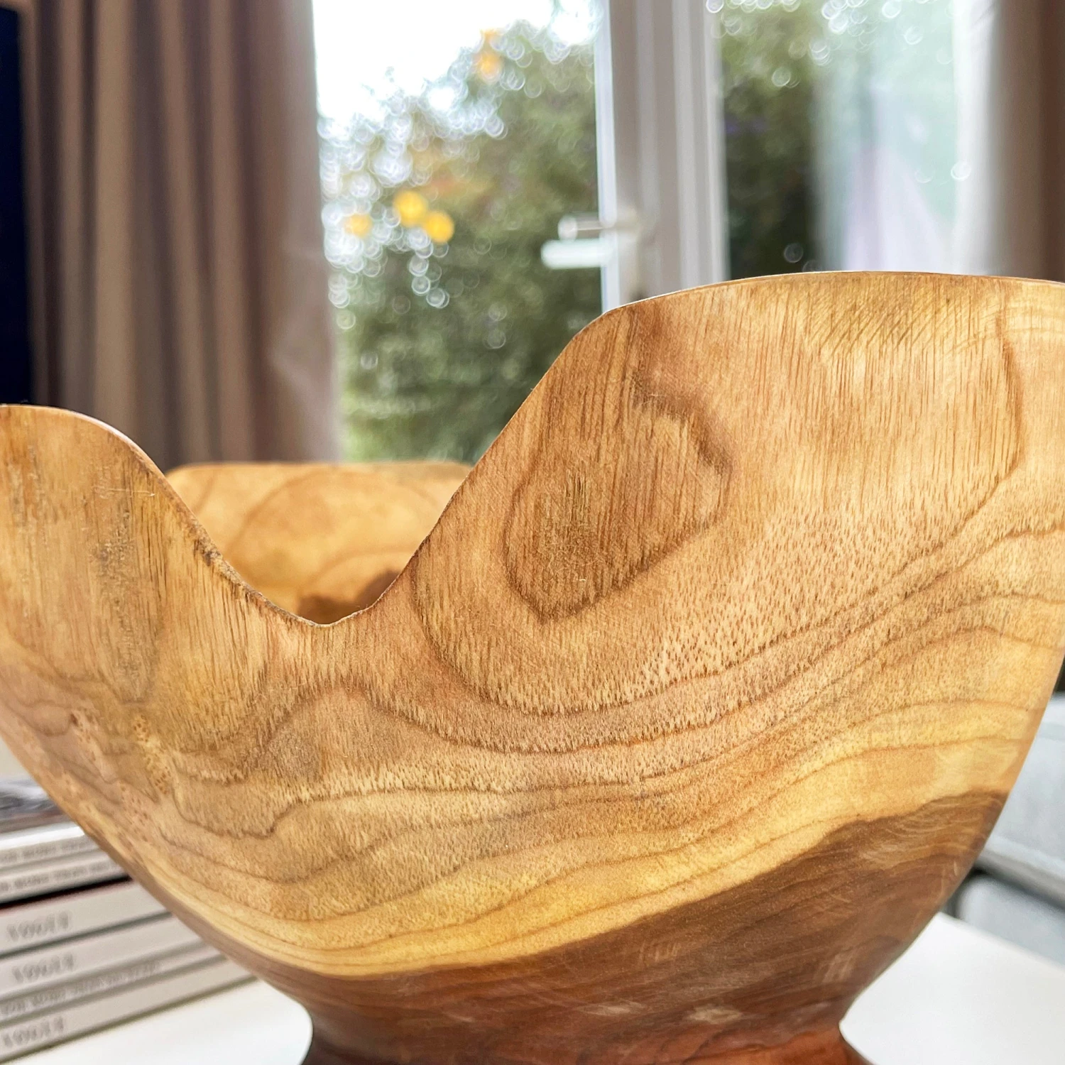 Hand carved teak wood buttercup bowl with a rustic varnished finish. This natural wooden bowl can be used for decorative purposes or as a fruit bowl. This bowl will add a rustic touch to your home or kitchen decor.