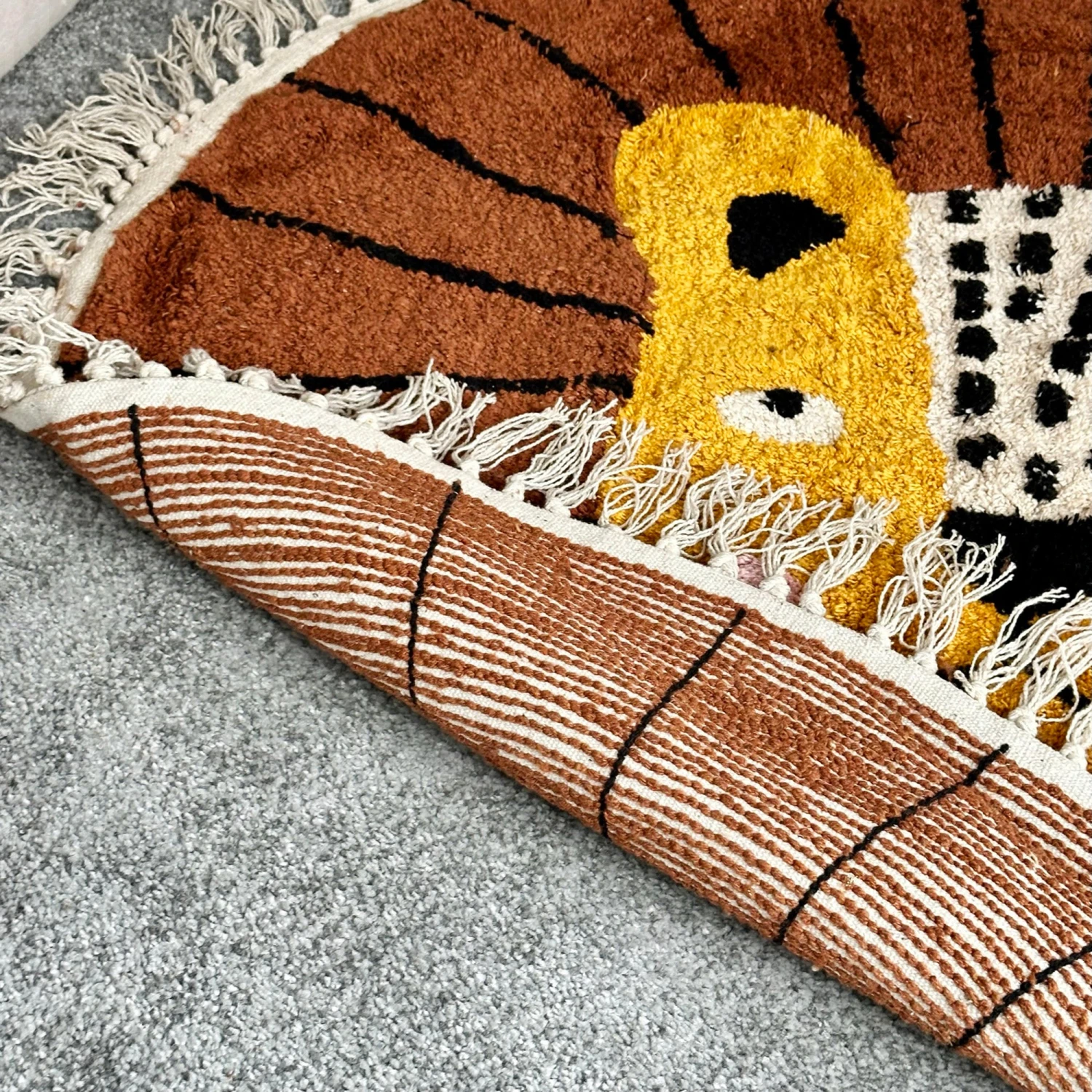 An animated tufted cotton rug boasting a cute lion with tassel decoration. This hard-wearing animal rug is soft and colourful, designed to add animal themed playful statement to fun childrens nurseries and bedrooms.