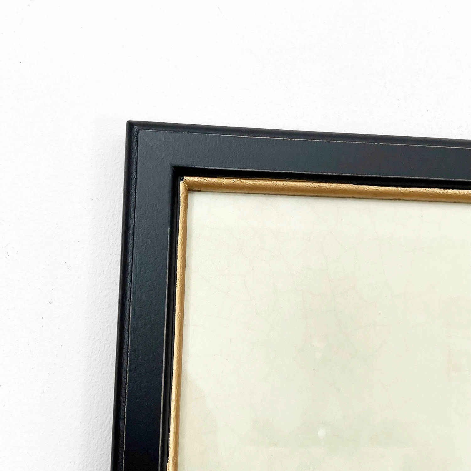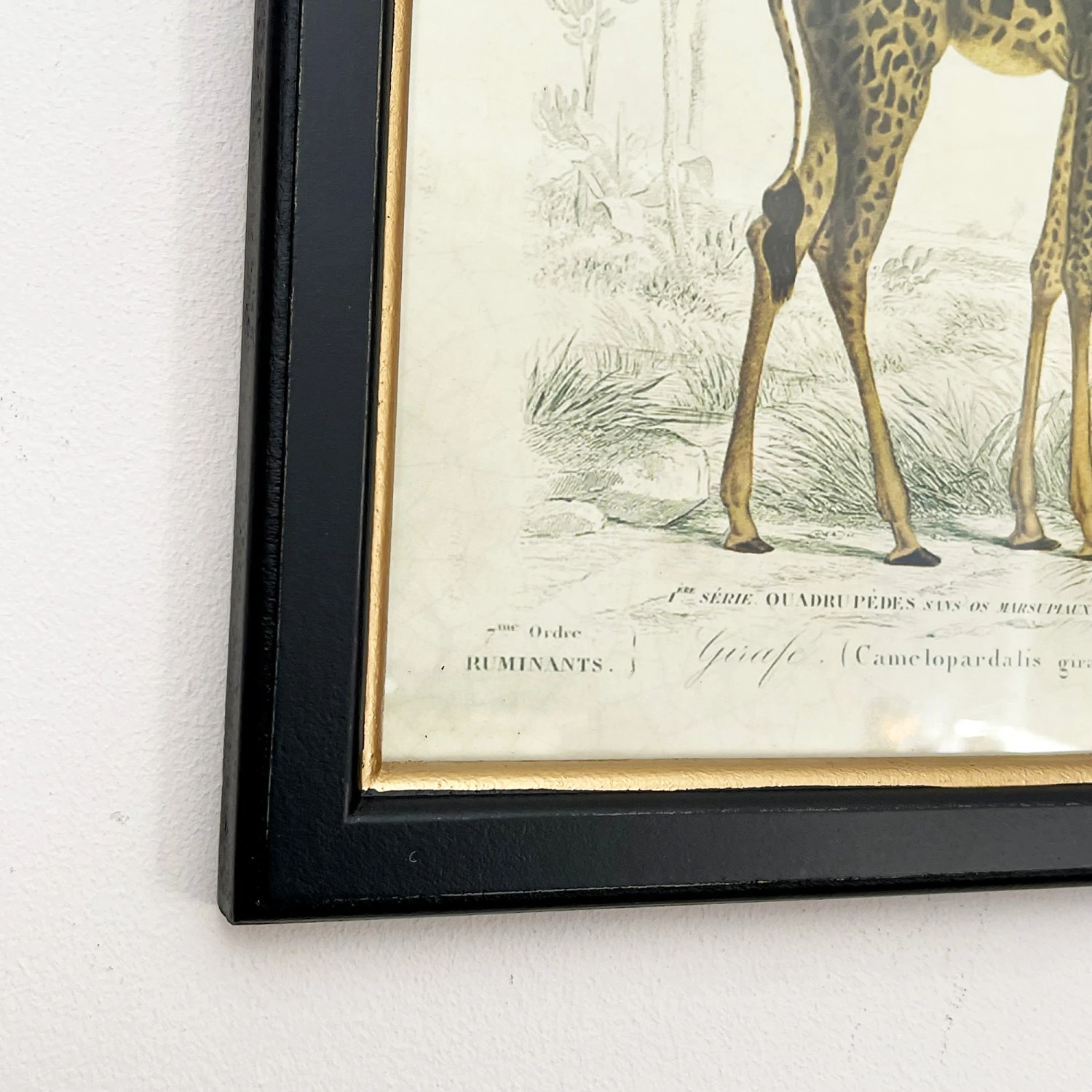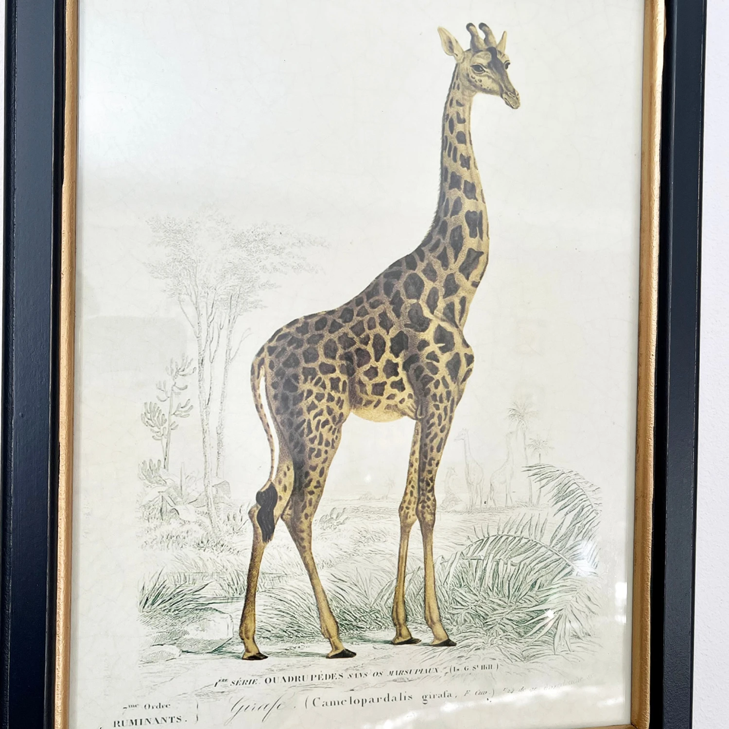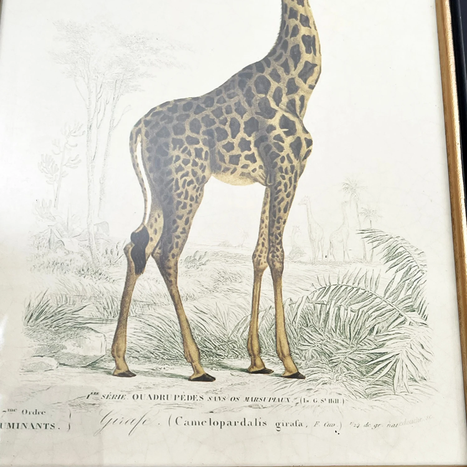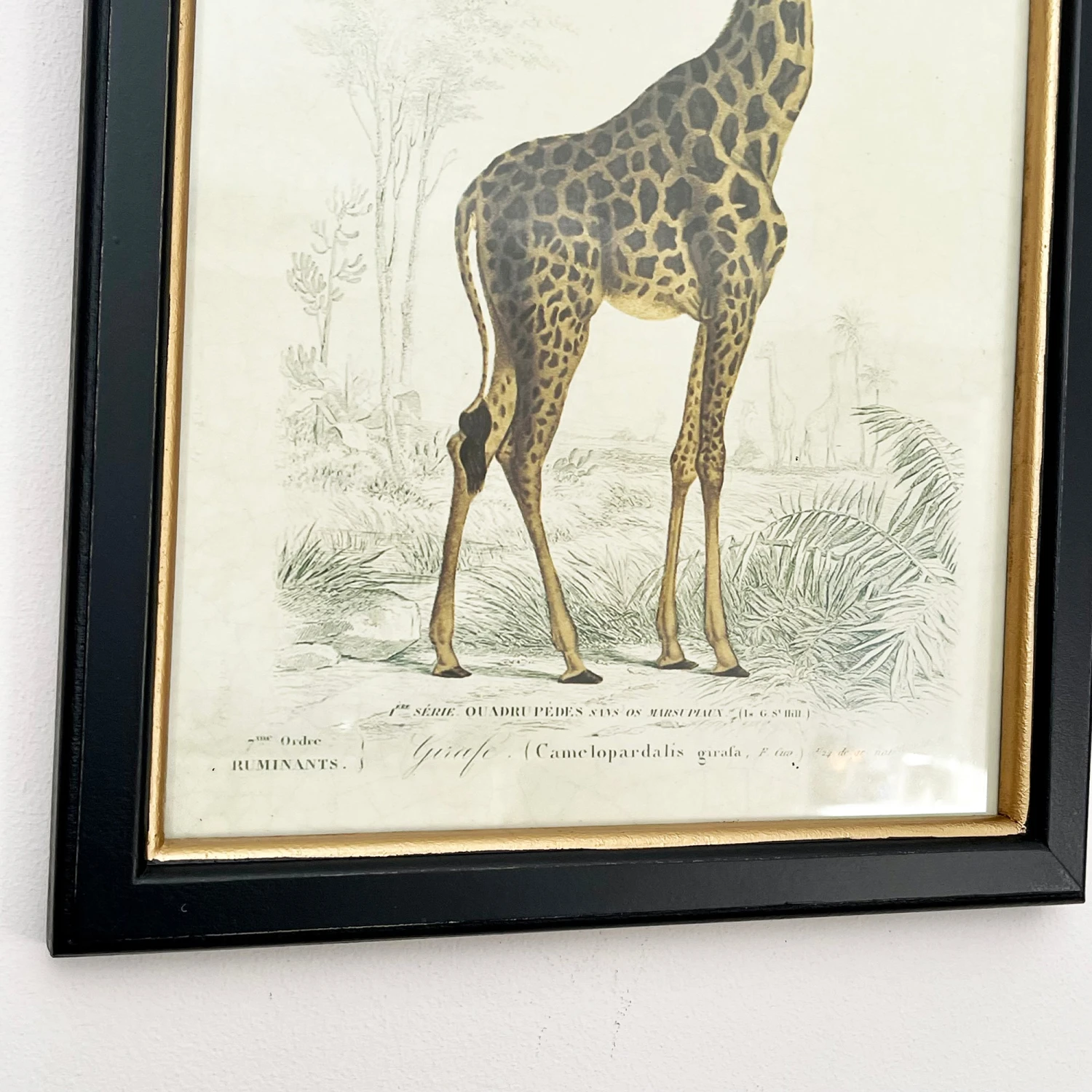 A stylish vintage style wall art in a veritcal black frame with a gold inner trim. Featuring a giraffe in a classic safari setting. This framed wall art is perfect for a giraffe lover to display in a living room or bedroom.