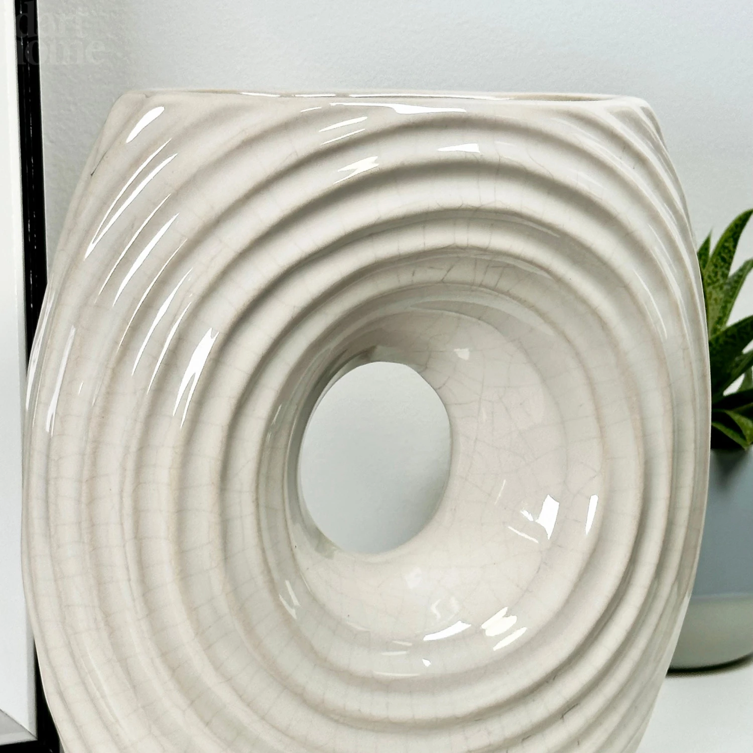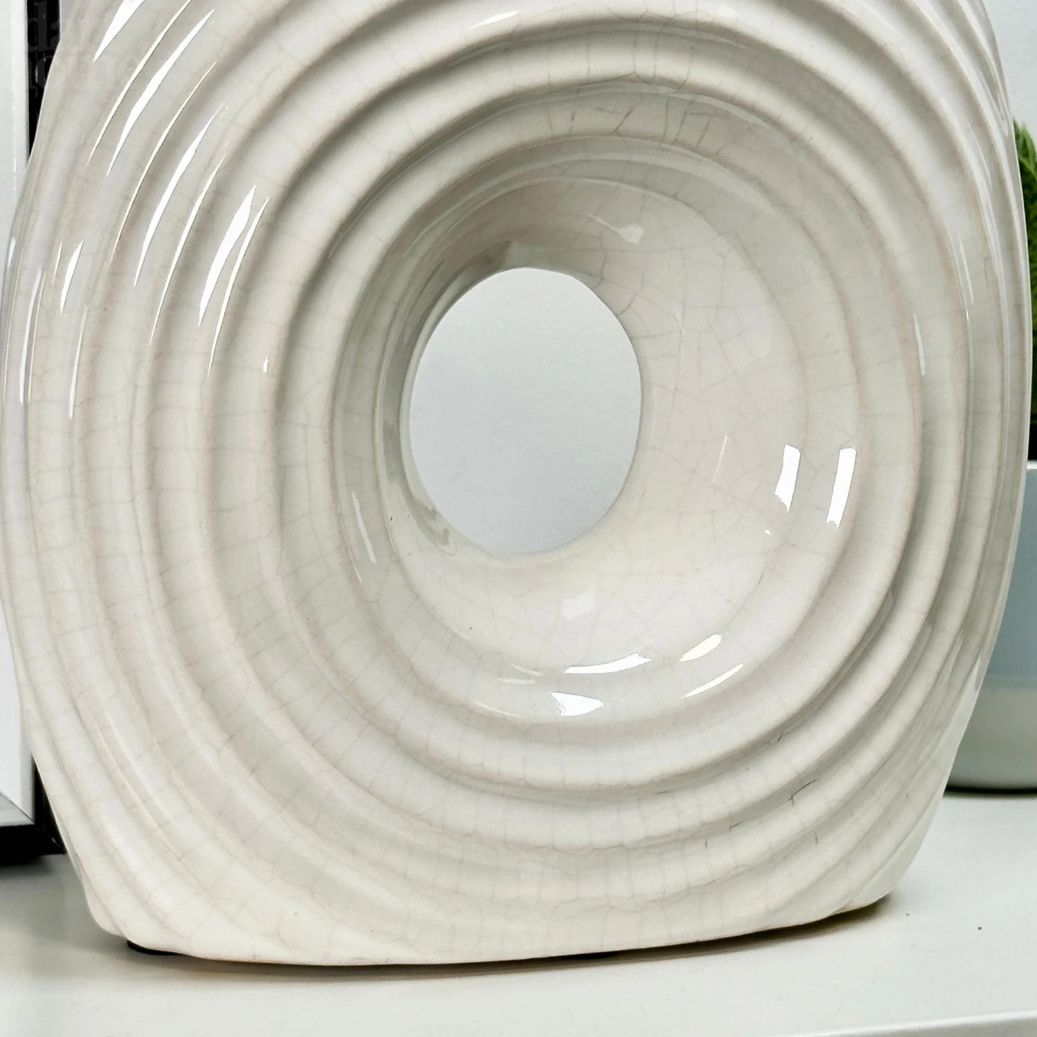 Give any room a splash of neutral decor with this round ribbed vase. Featuring a round donut shape with a crackle effect glazed ceramic finish, this donut vase is perfect for holding flower buds and stems.