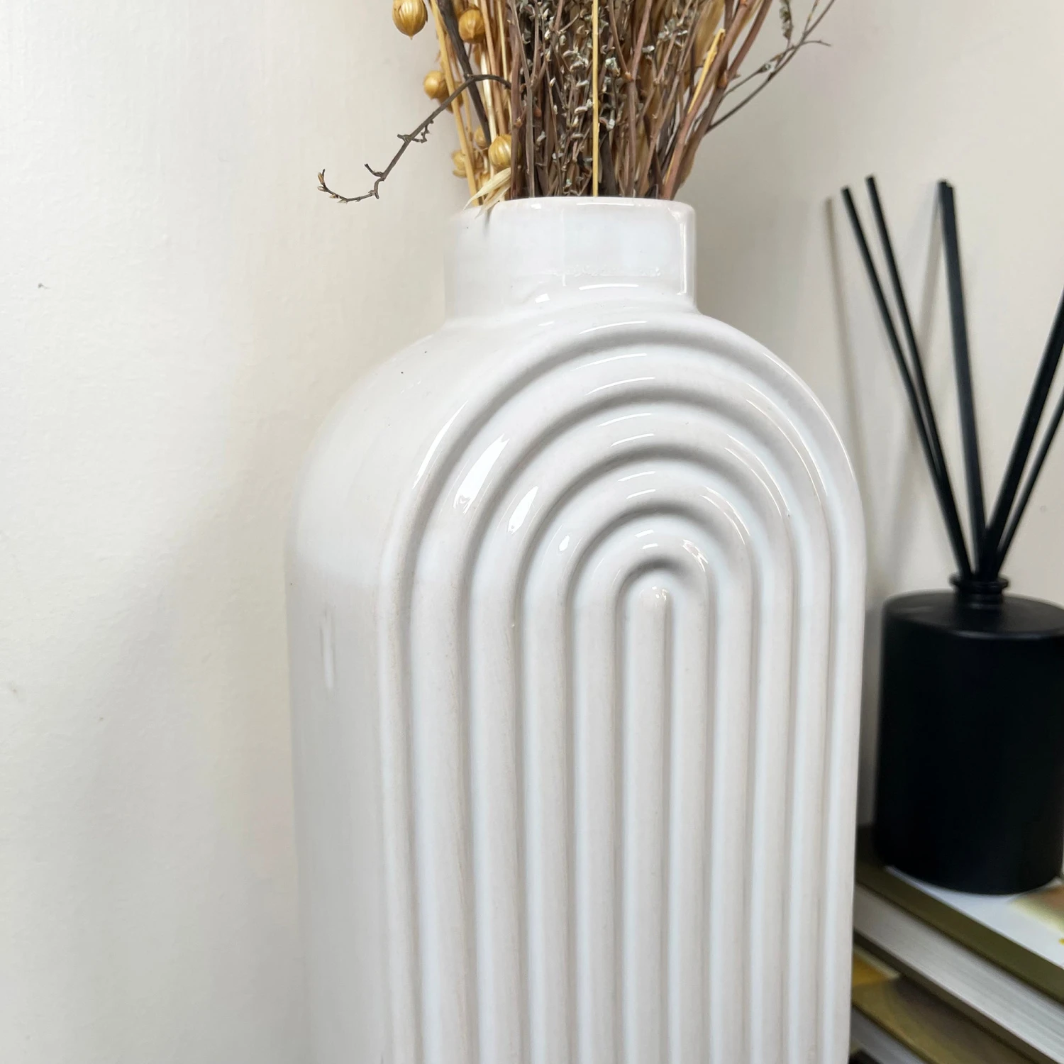 Made from ceramics, this modern style oval vase boasts a deep ribbed glazed finish and is finished with a beautiful soft white tone perfect for a neutral home.
