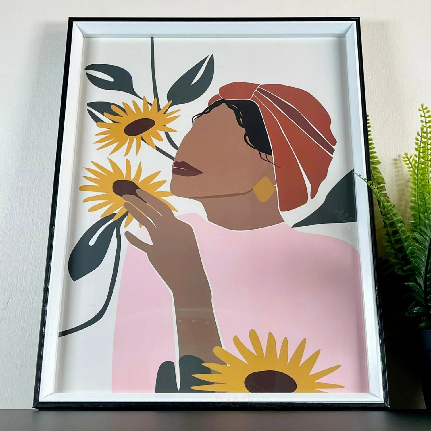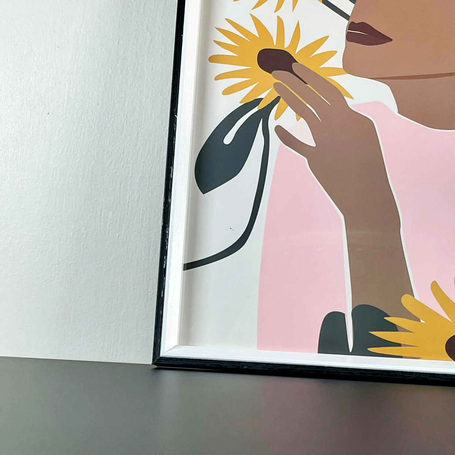 A moderism, abstract style print filled with subtle colour that will fit perfectly into your existing home decor. This framed print piece of wall art features a natural woman amongst some brightly coloured yellow sunflowers. This simple design offers a stylish addition to your home and can be placed on the wall of any room.