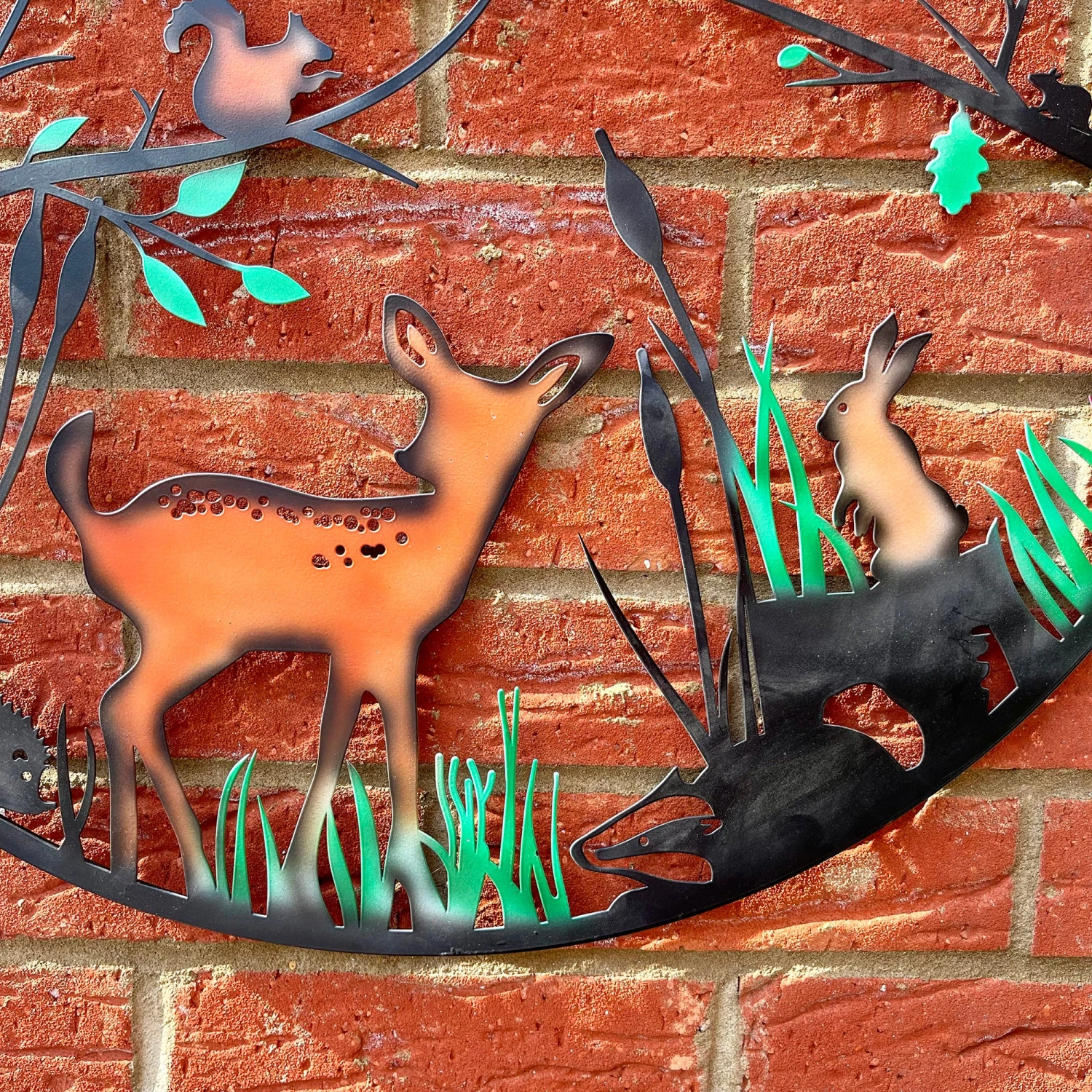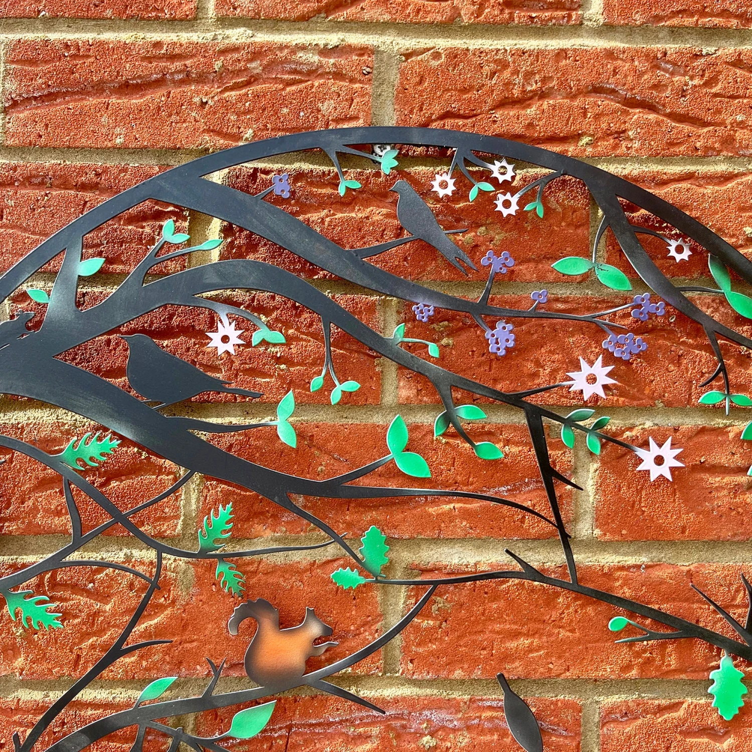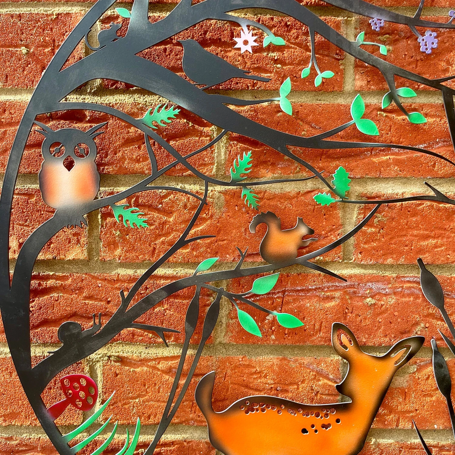 Wildlife themed garden wall art featuring an array of woodland animals like deer, owls and bunny rabbits to name a few. Filled with neatly placed splashes of colour throughout the animals, flowers and trees completely transforming this wall art and bringing everything in it to life.ย Its open design allows sun to shine through, also offering a glowing silhouette on the wall or fence of your garden space. Perfect gift idea for woodland wildlife lover and an easy decorative piece to personalise and colourise a garden space.